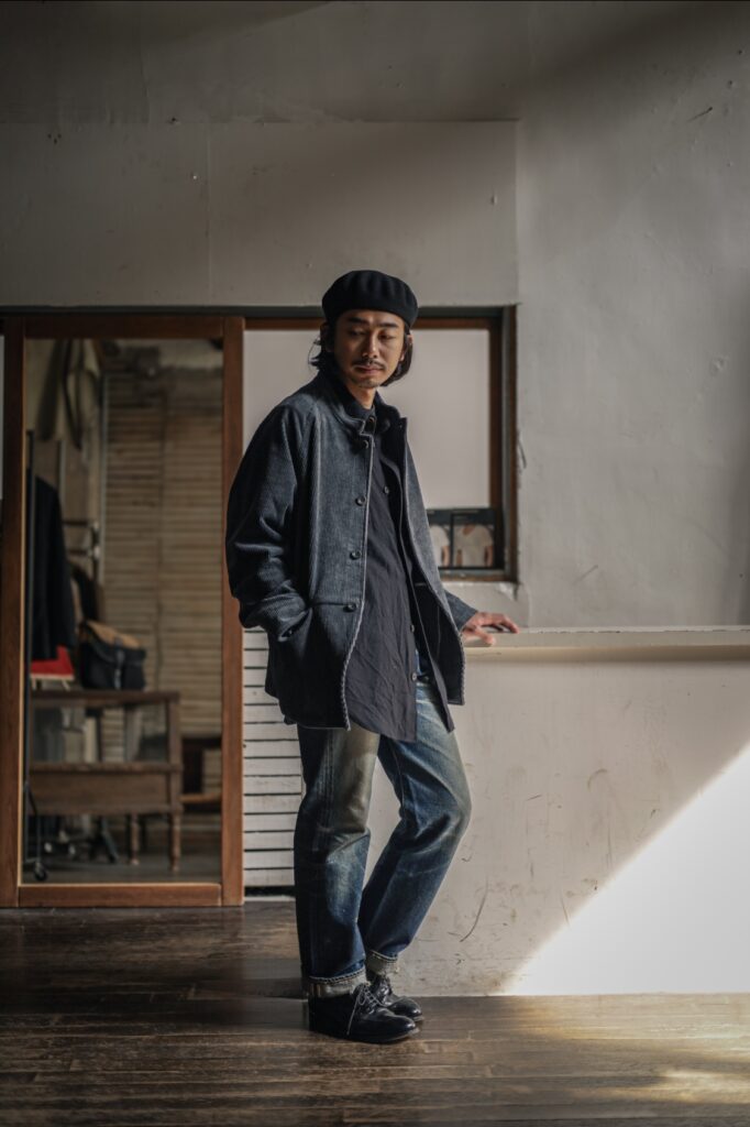 英国のワークジャケットを彷彿とさせるスタンドカラーに、