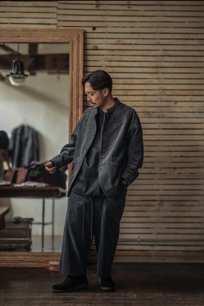 フレンチワークやハンティングを彷彿とさせる杢グレーコーデュロイ。