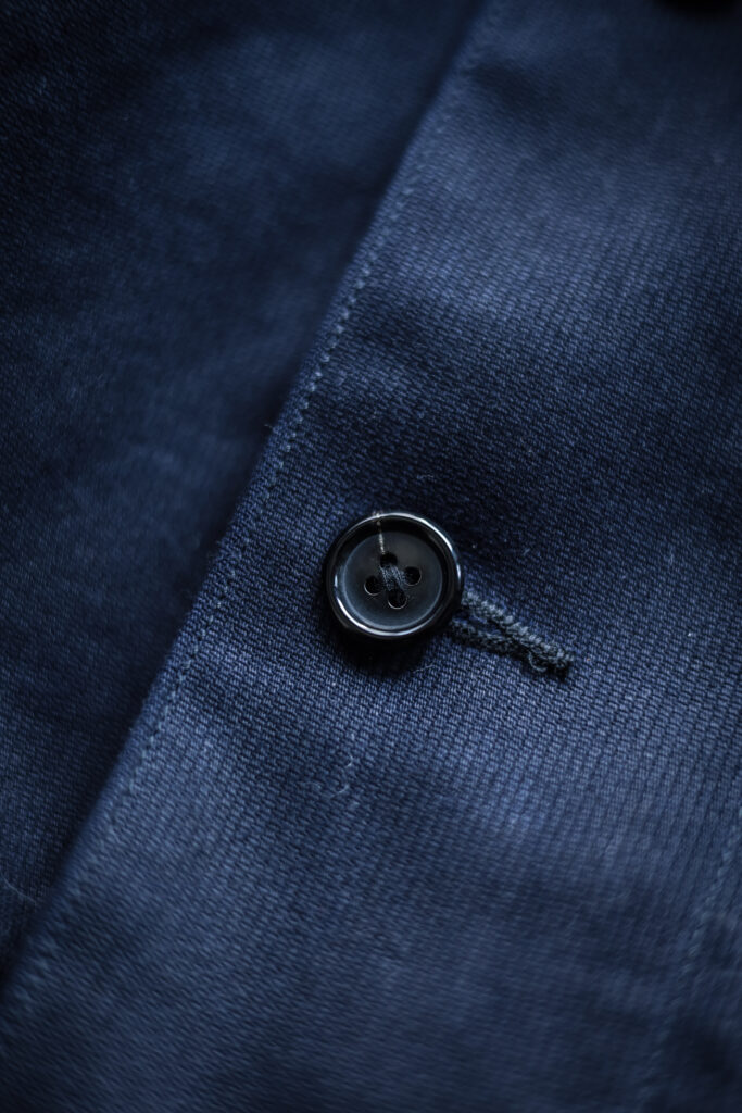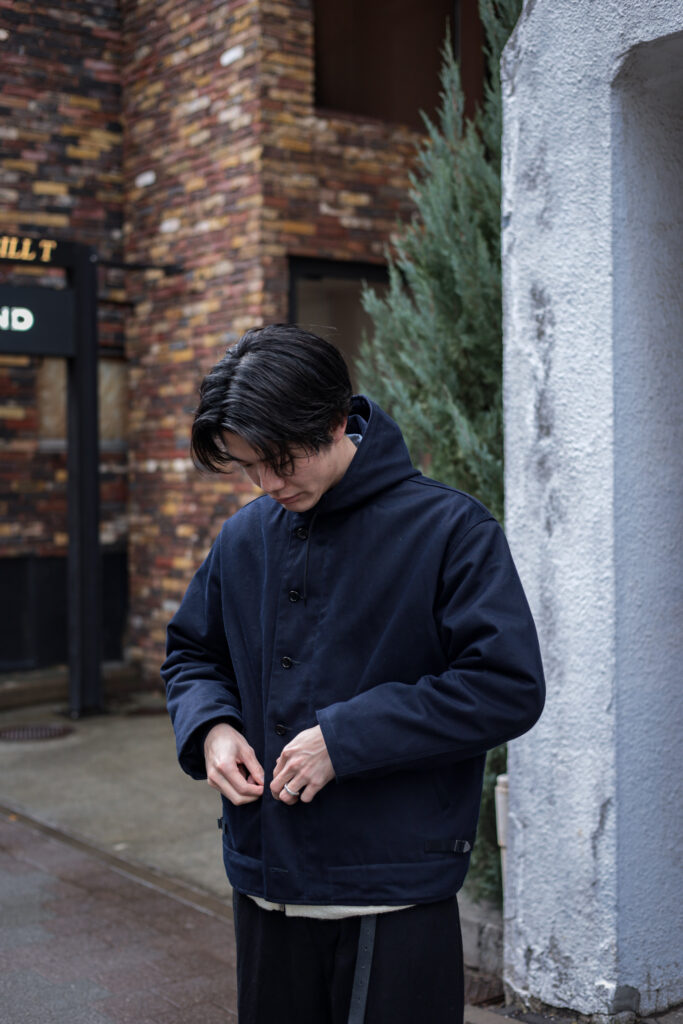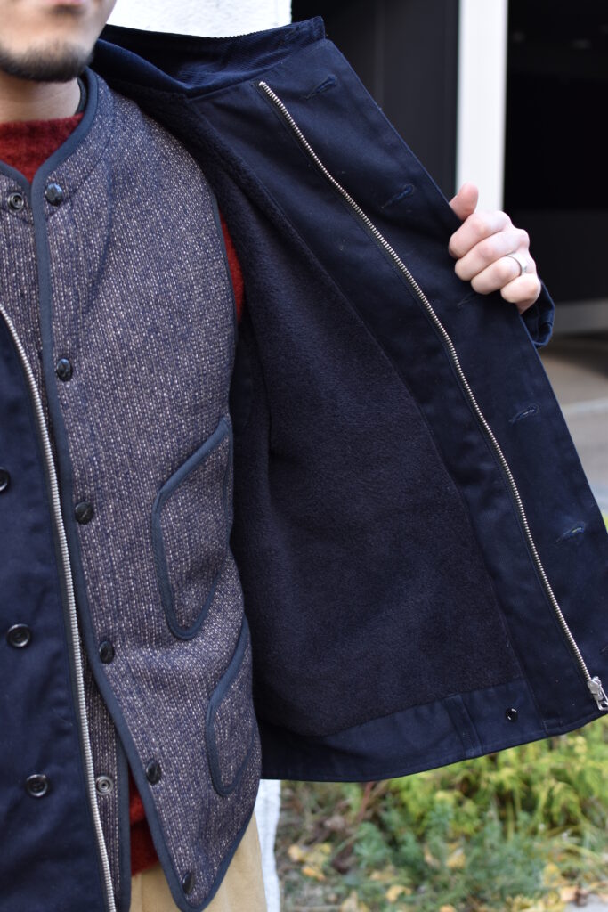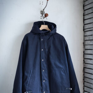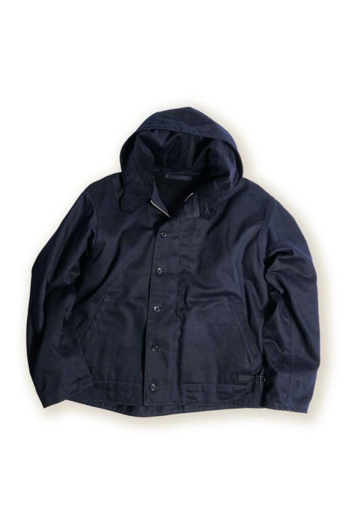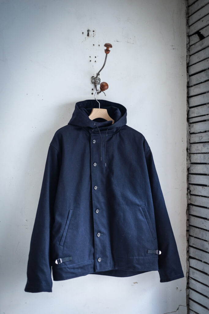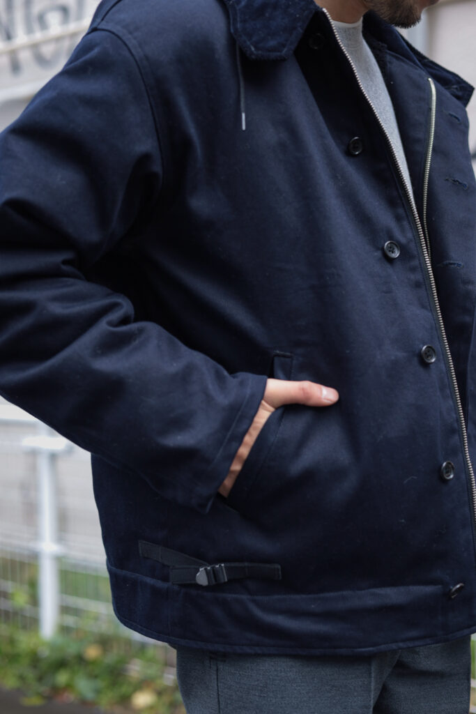 表地には1940年代頃のアメリカ海軍のデッキジャケットに採用された耐久性や耐風性に優れた「コットングログラン」の生地をさらにオイルド加工を施し、艶感や深みのあるネイビーブルーを演出しました。