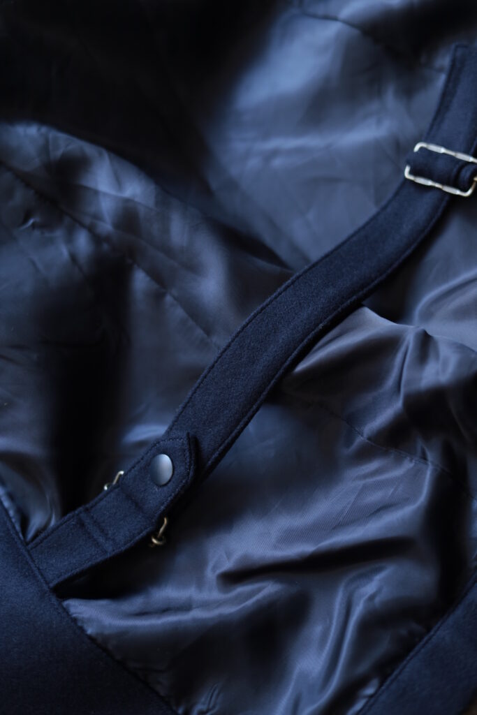 モーターサイクルコートには欠かせないレッグベルトですが、不要な人はドットボタンにて取り外せる仕様に。