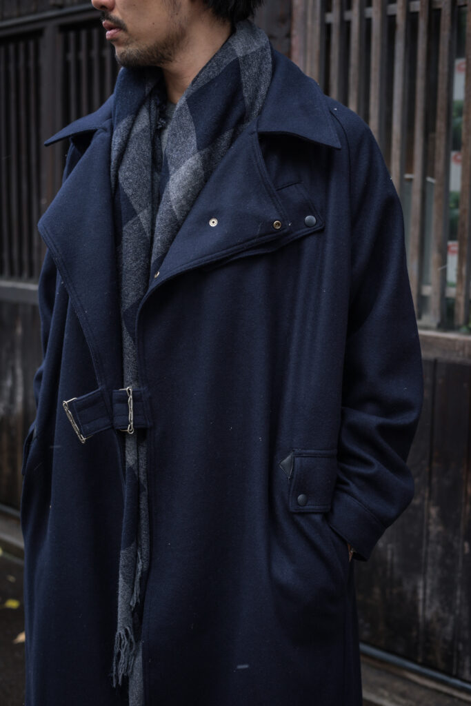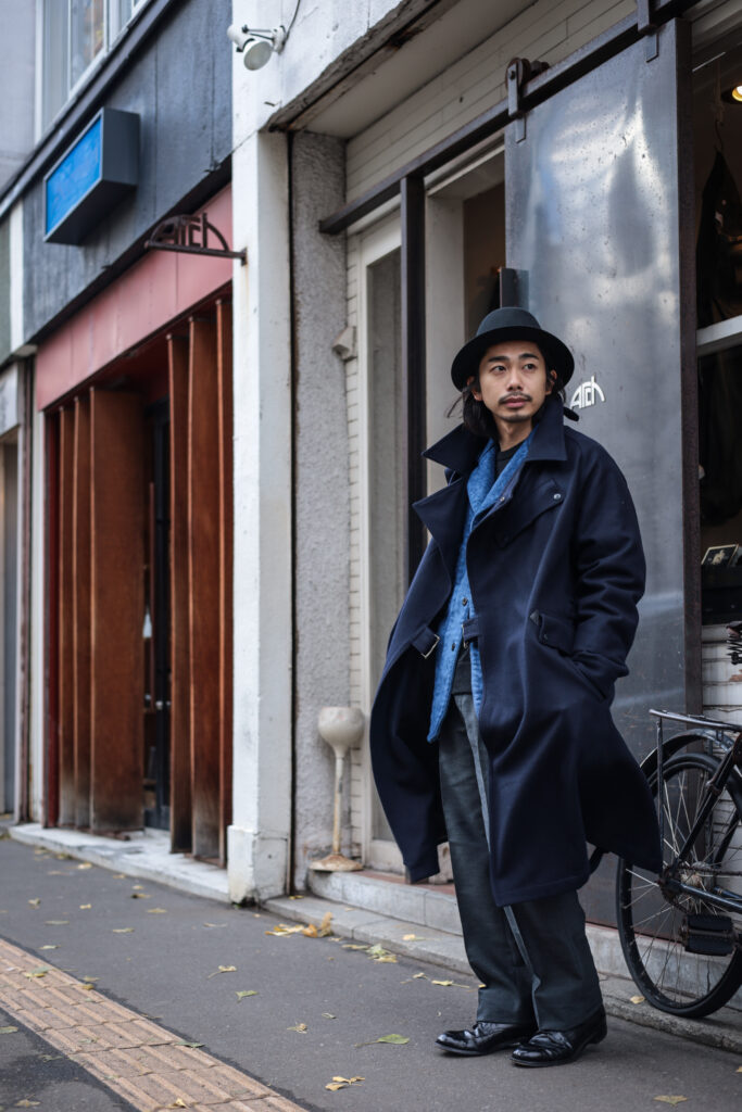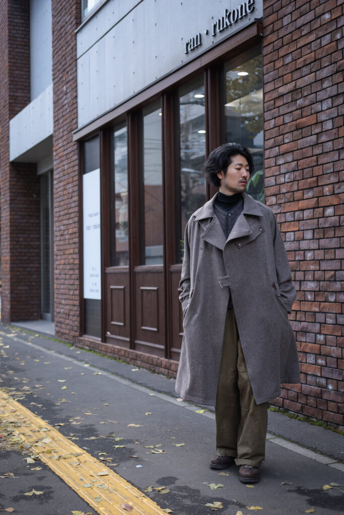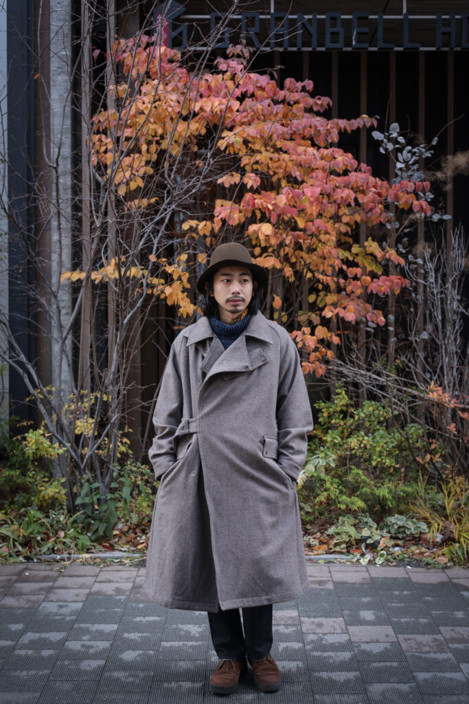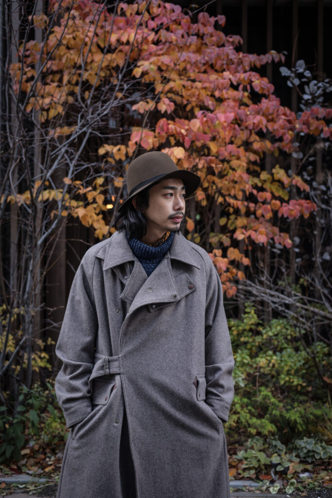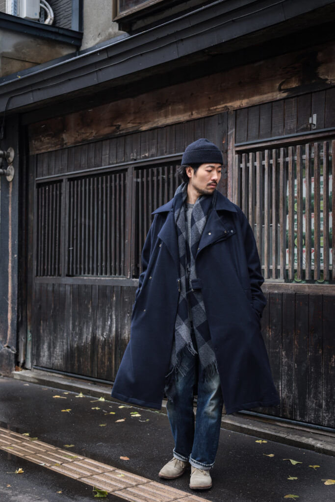 イギリス製のローゲージセーターに5ポケットジーンズ、足元はチャッカブーツというスタイルは、このコートを製作する上で、一番最初に思い描いていたスタイル。