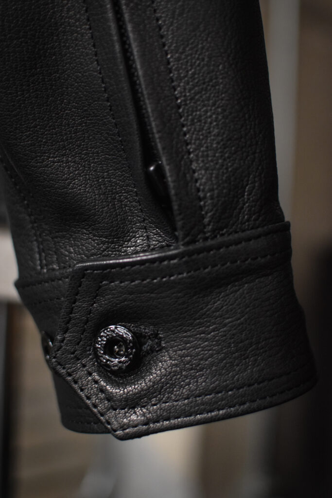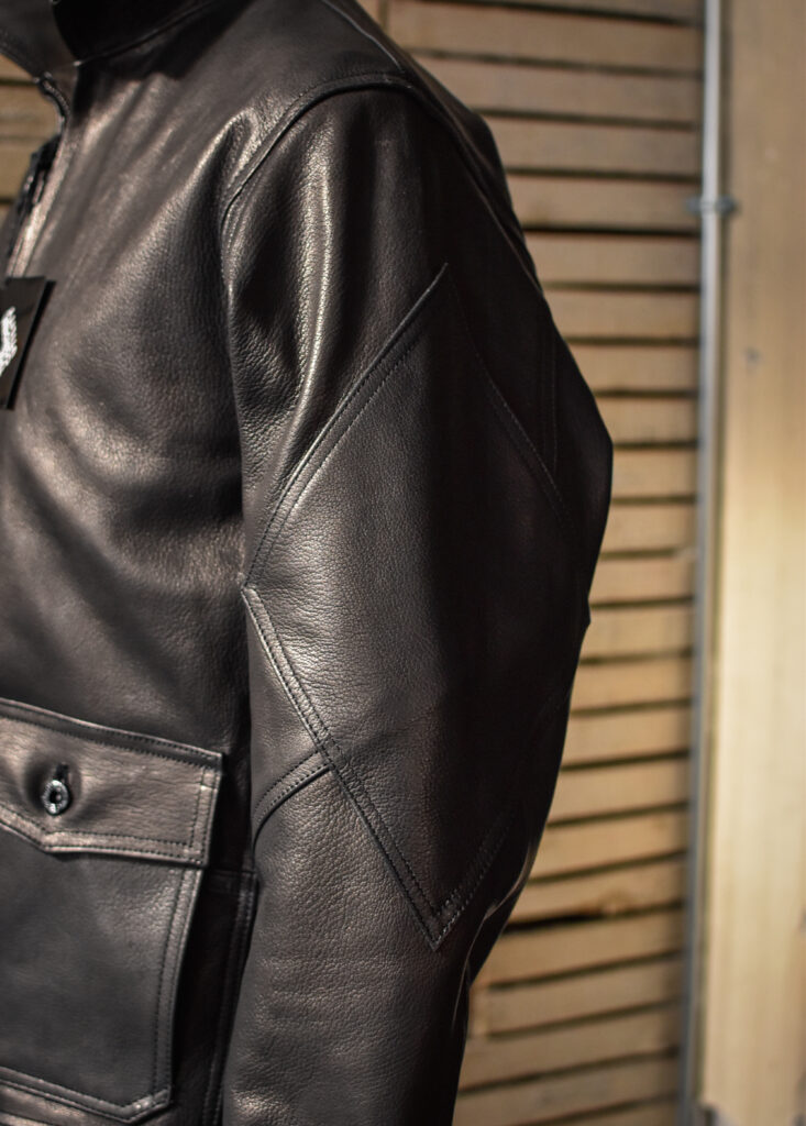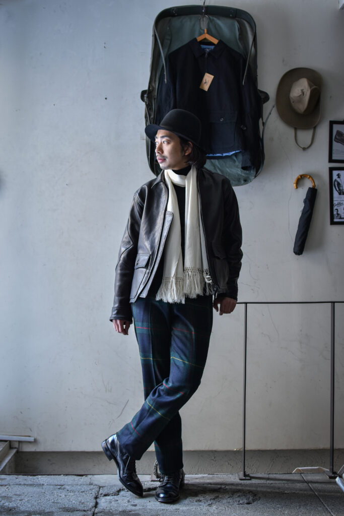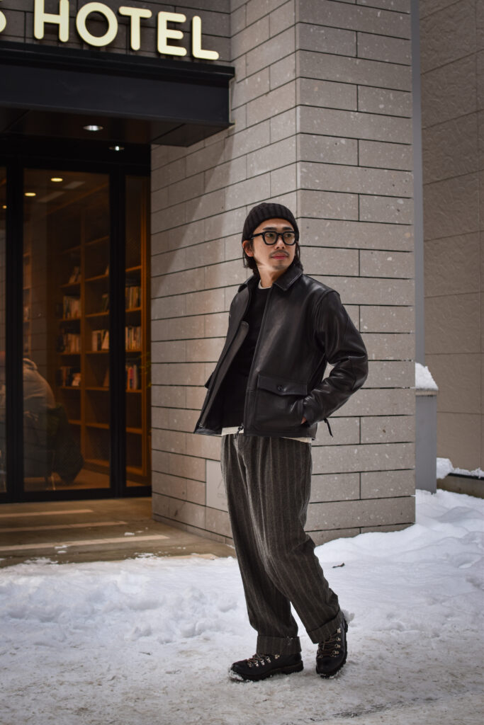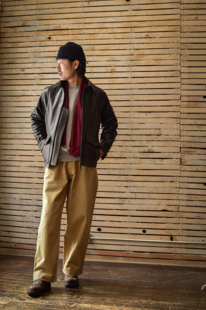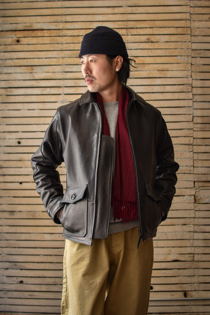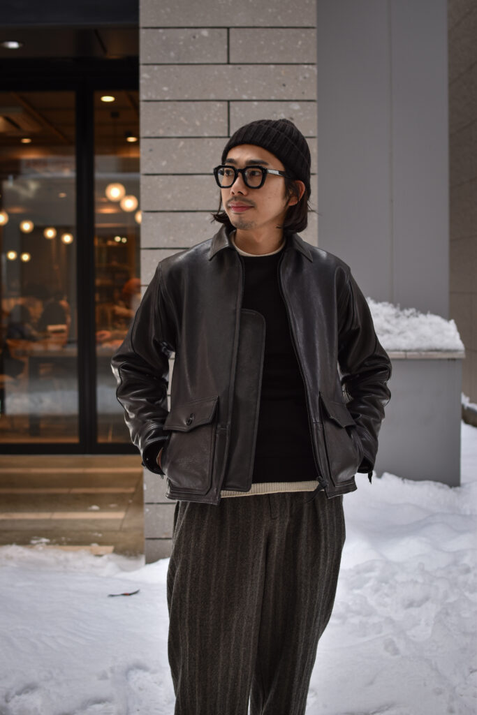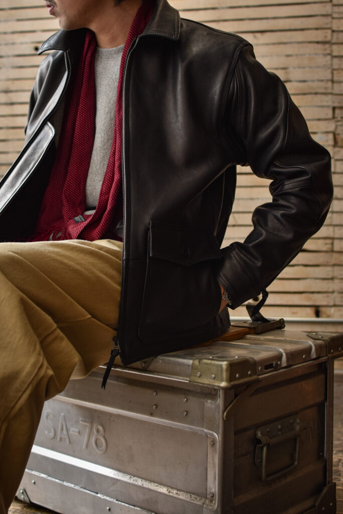 肉厚でミリタリーらしいレザージャケットでありながら、表情の高級感や上質なレザーだからこそ艶っぽさのあるトラウザーズや、デザイナーズブランドとの相性も抜群です。