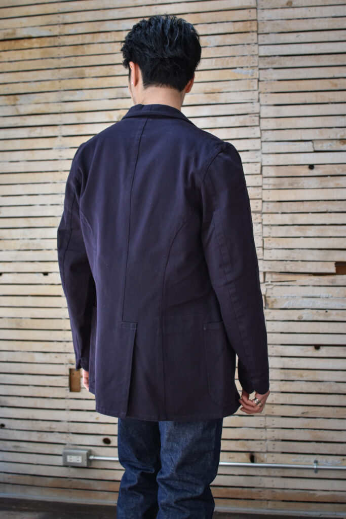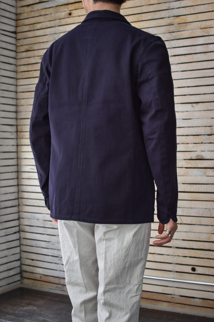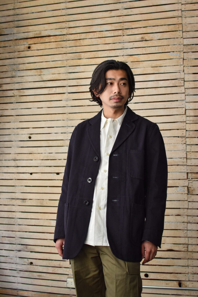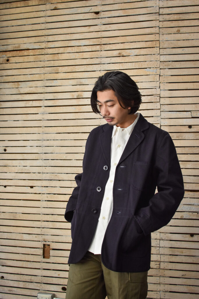 浅めのVゾーンによるサックコートのようなシルエットでありながら、ワークウェアの背景を持つエレガントな佇まいです。