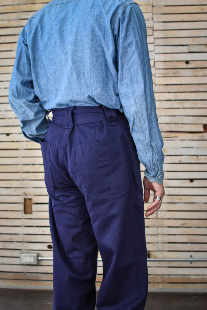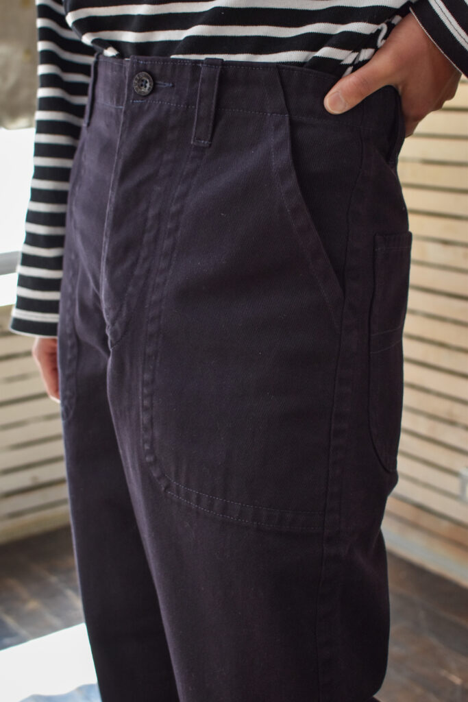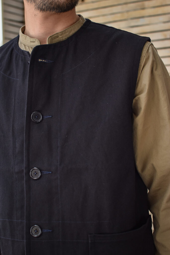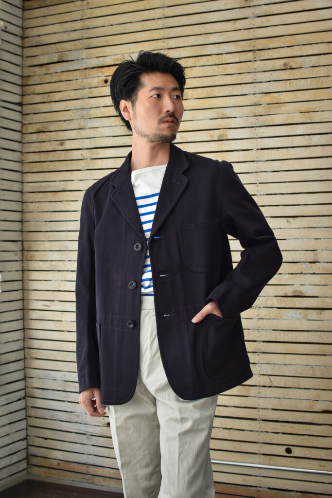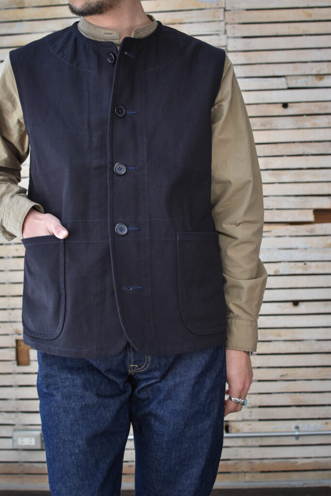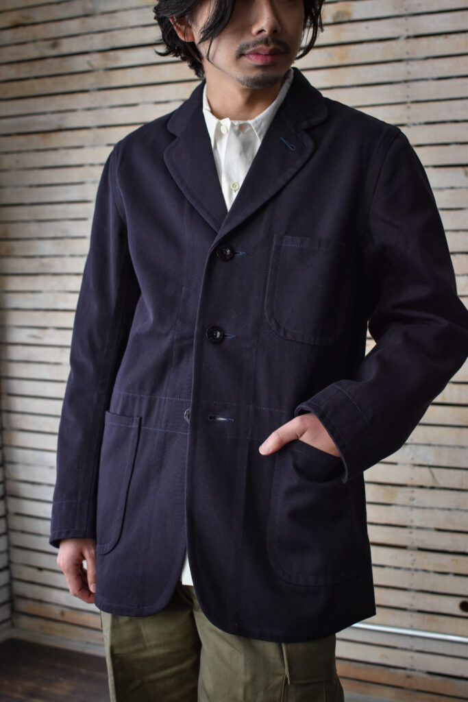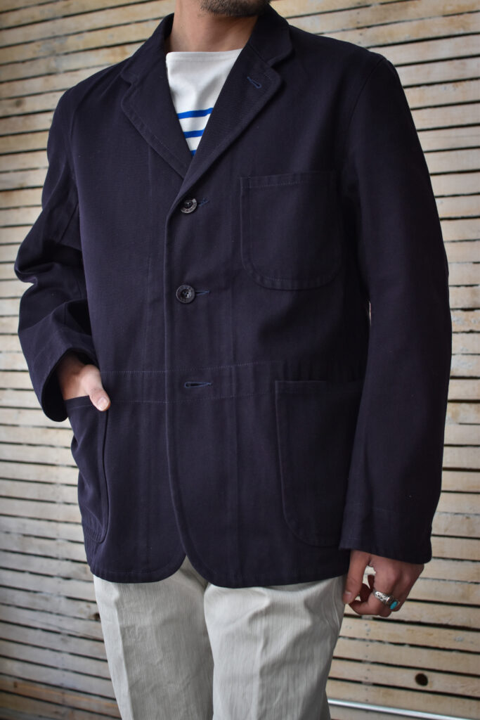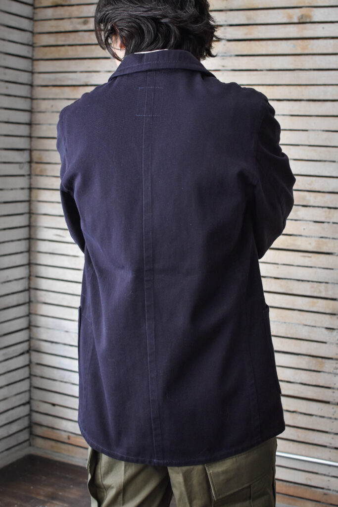 フランスのワークジャケットにもよく見られる可愛げのあるディテールですが、それと比べると構築的で無骨な表情。