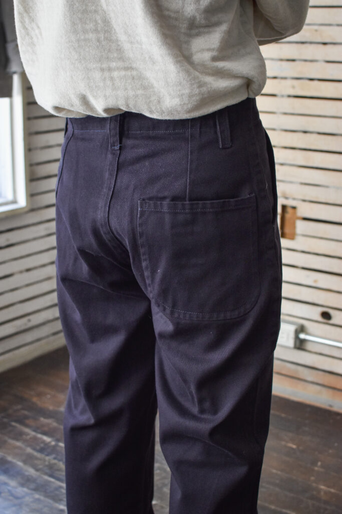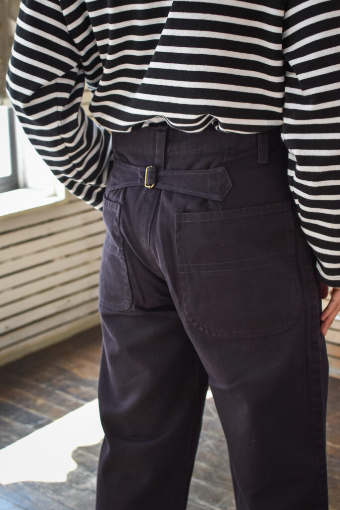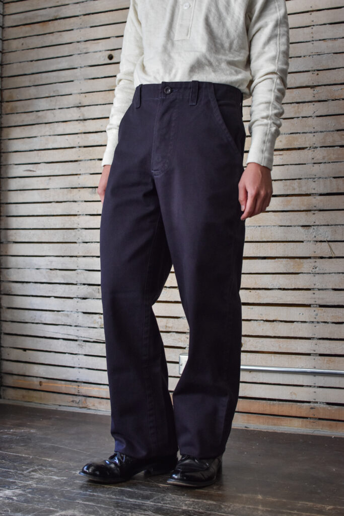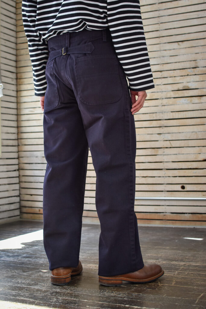 戦間期にサフォーク海岸で人気を博した、シンプルで丈夫なキャンバス地の伝統的な船乗りジーンズ。