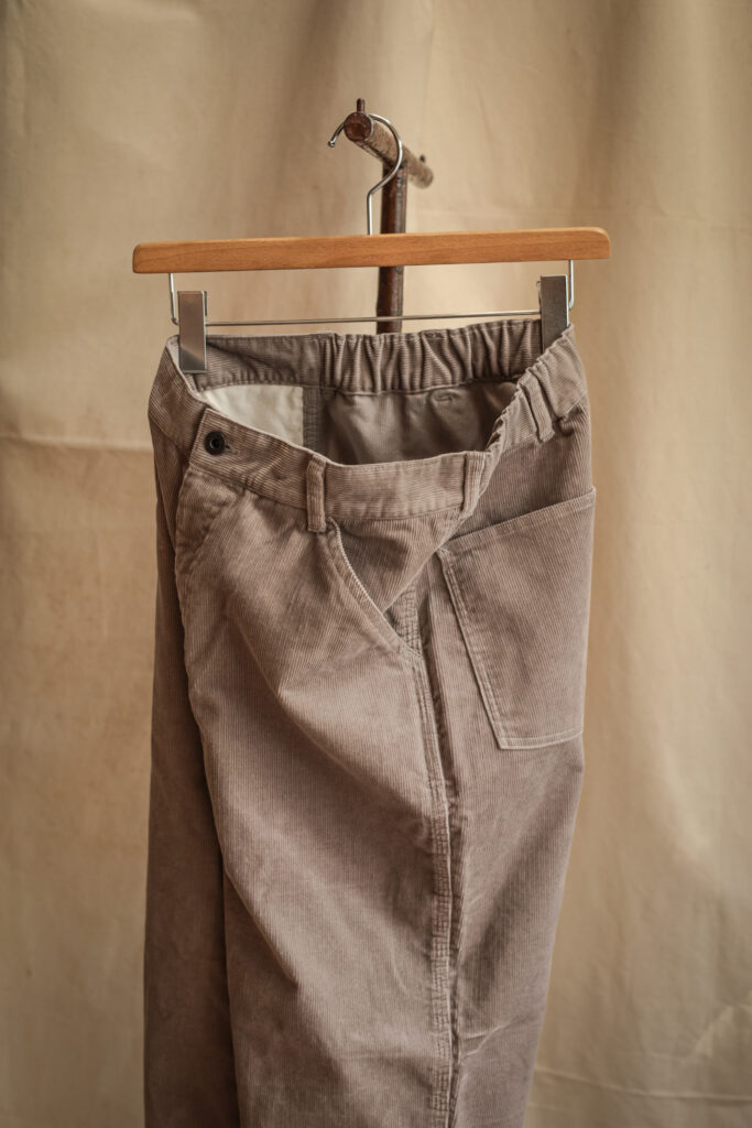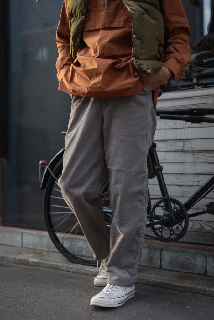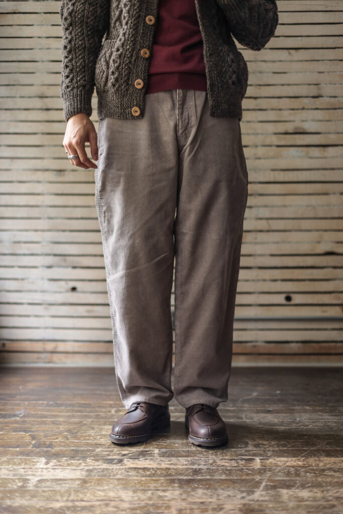 冒頭のお話とは少し食い違う点もありますが、中畝のコーデュロイは春夏だと、コットンのパンツよりも蒸れにくく、秋冬は素材感でヘビーなトップスと合わせても生地負けをしないのです。