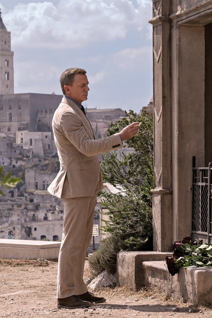 写真は、映画『007 No Time To Die』の序盤で、ダニエル・クレイグ演じるジェームズ・ボンドが、かつての恋人ヴェスパーの墓参りに訪れるシーン。