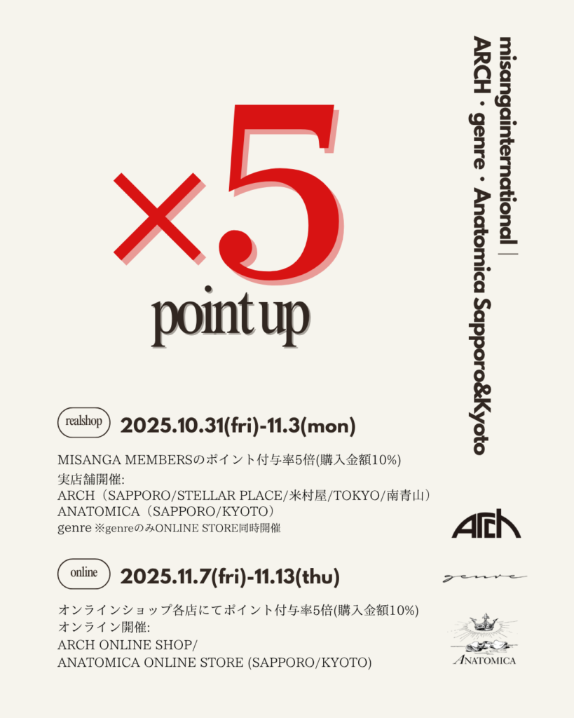 また、11/7(金)20:00〜11/13(木)23:59まで、 [ARCH ONLINE SHOP]と[ANATOMICA ONLINE STORE (SAPPORO&KYOTO)]にて、ポイントが5倍!