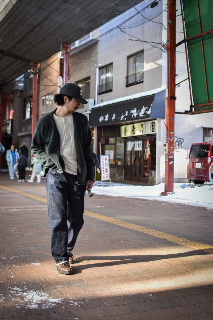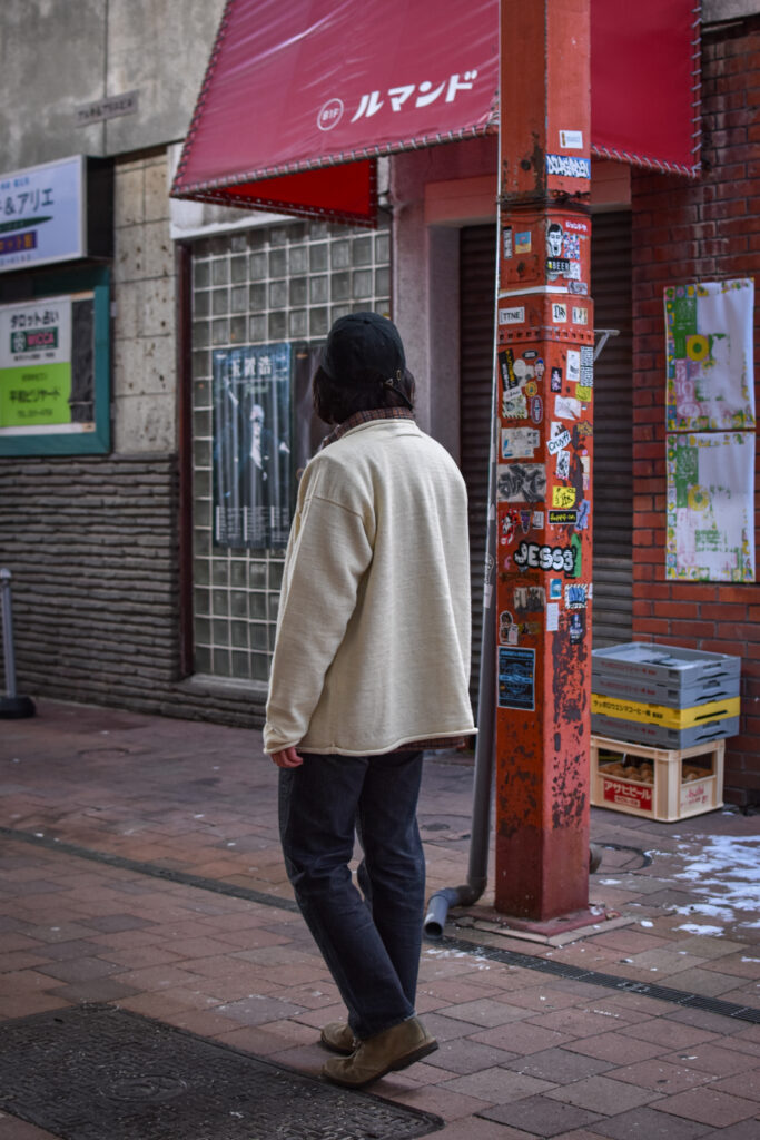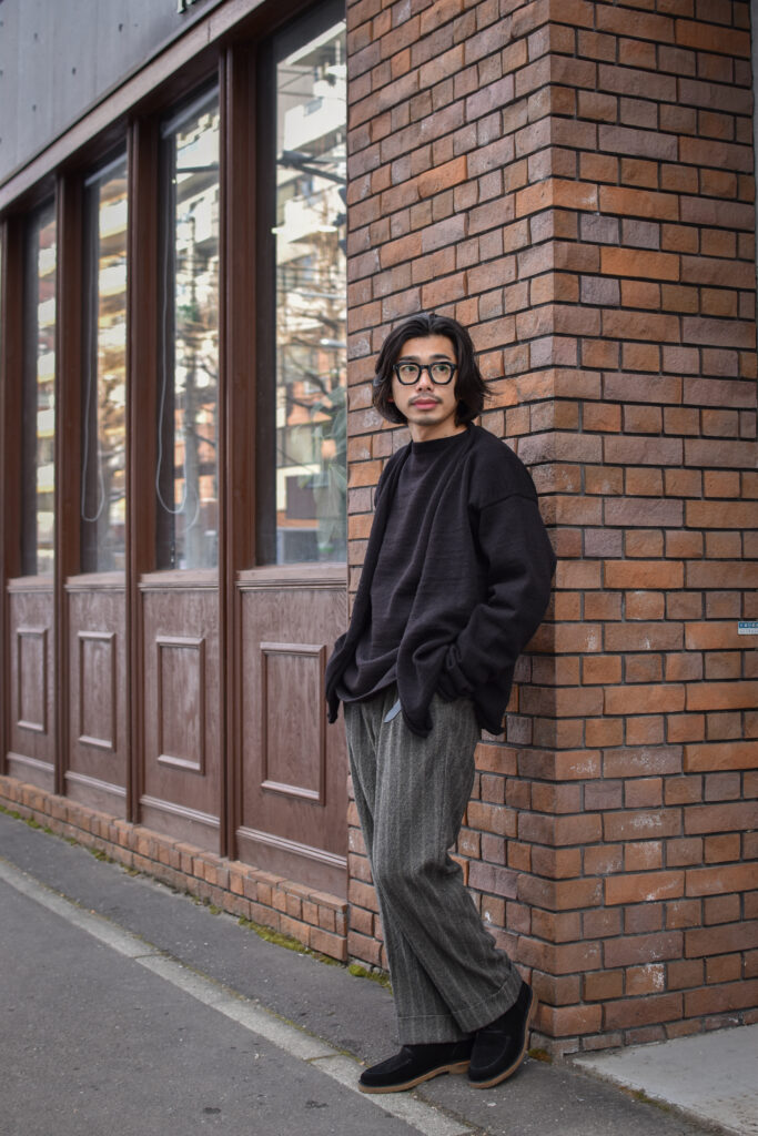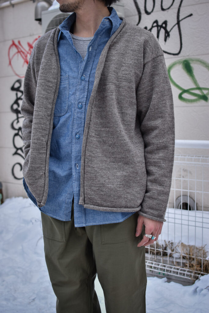 北海道羊毛特有の良い意味粗野な雰囲気と、このカーディガンが持つ少しアンニュイな雰囲気が絶妙にマッチしている。。。