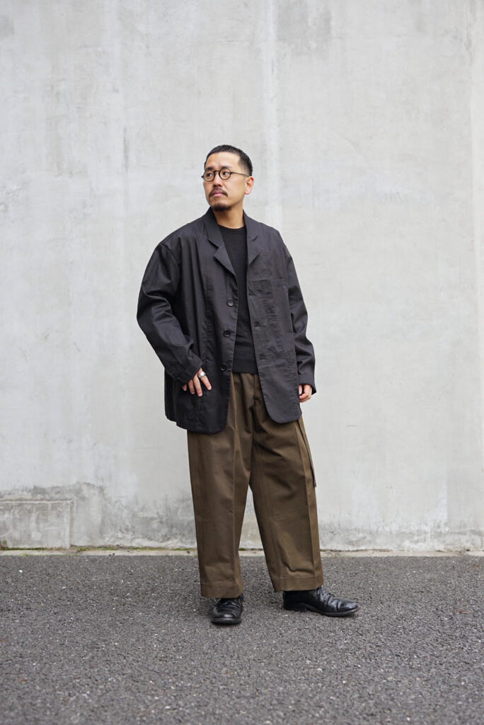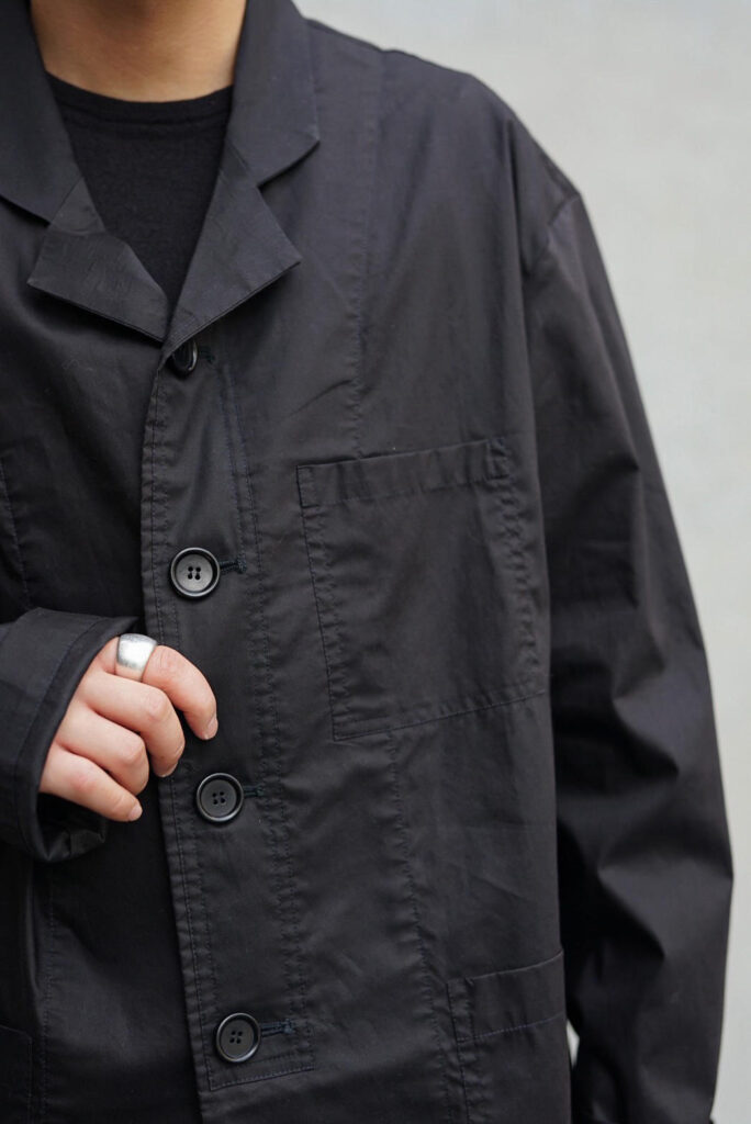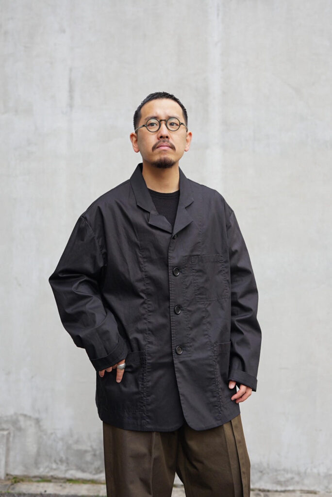 形としてはアメリカンワークカバーオールのような、ヒップを隠すか隠さないかの安心感のある着丈に、フレンチワークジャケットを彷彿とさせる3パッチポケットの小ぶりなラペルジャケット。