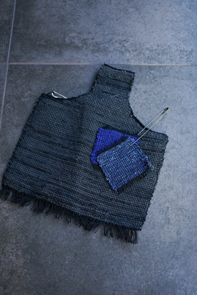 手織りならではの素朴さと、天然染めの糸らしい枯れた色合い、ネイティブな雰囲気が個人的に好きで、これをベースにMarck氏が持つ手織り生地で表現したら面白そうだなと、直感的に感じたので提案。