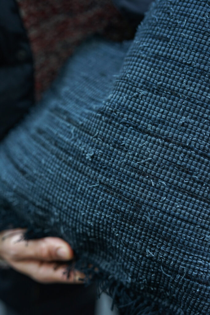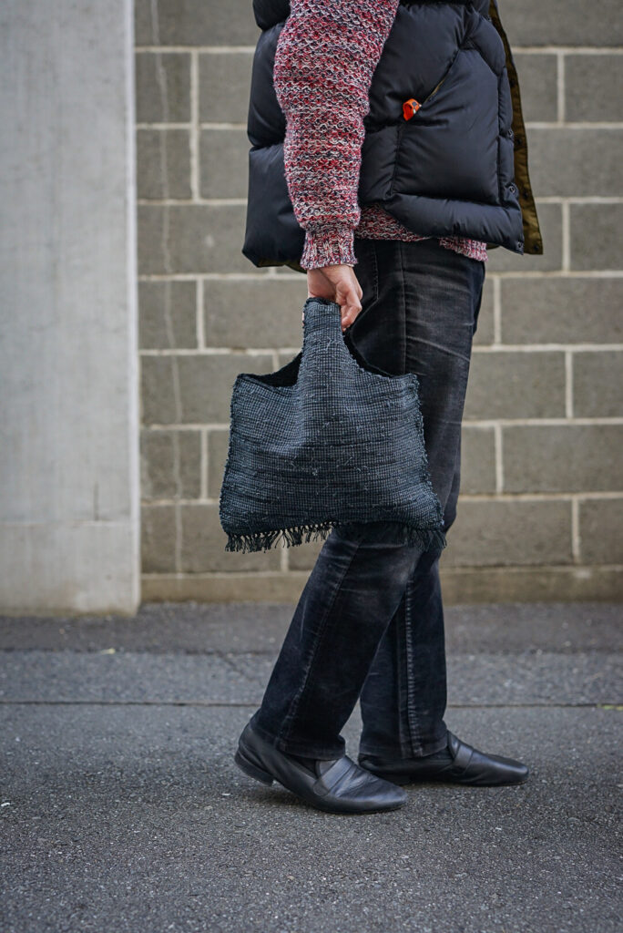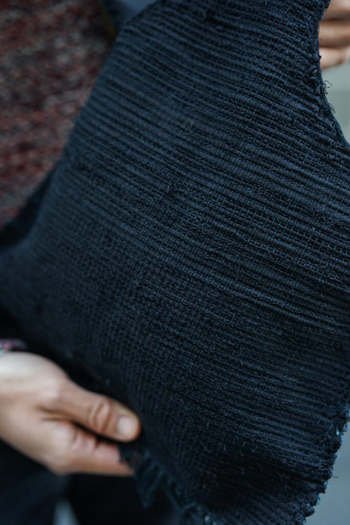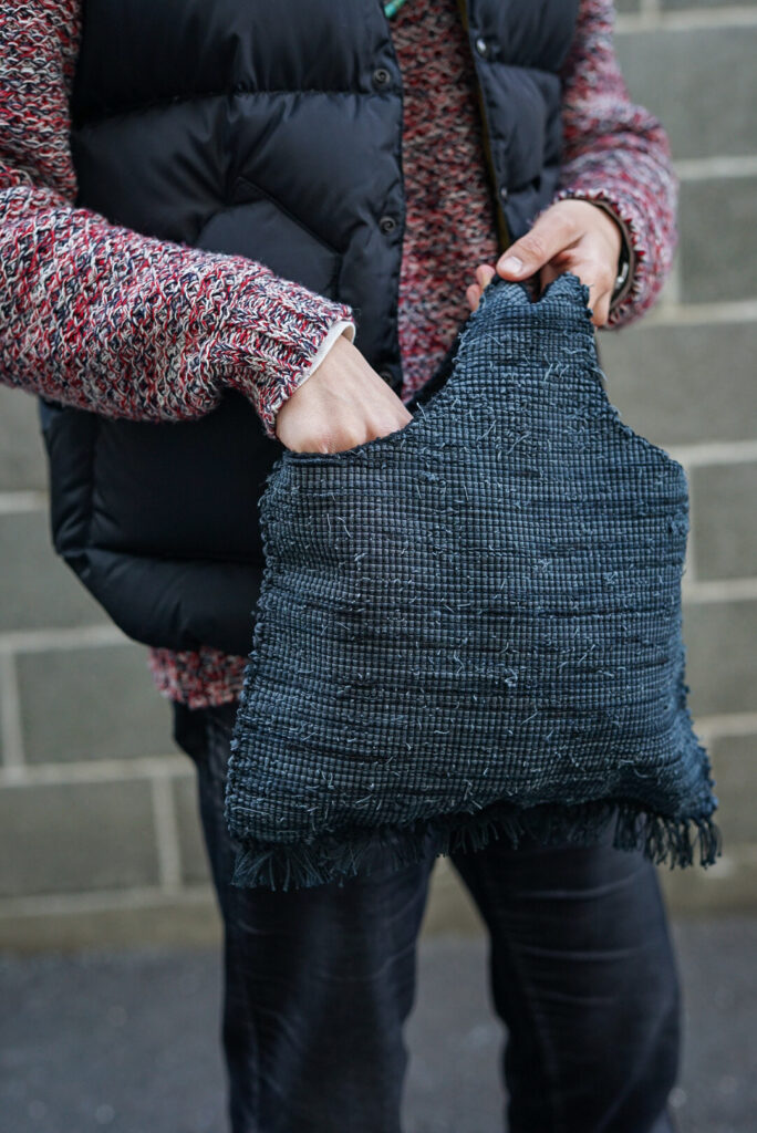 「裂き織り」と呼ばれる日本に古くから伝わる技法を用いており、「裂き織り」とは古い布を一度細かく裂いて帯状に整形しそれを手織りで再び織り直すという、非常に難しい技術です。