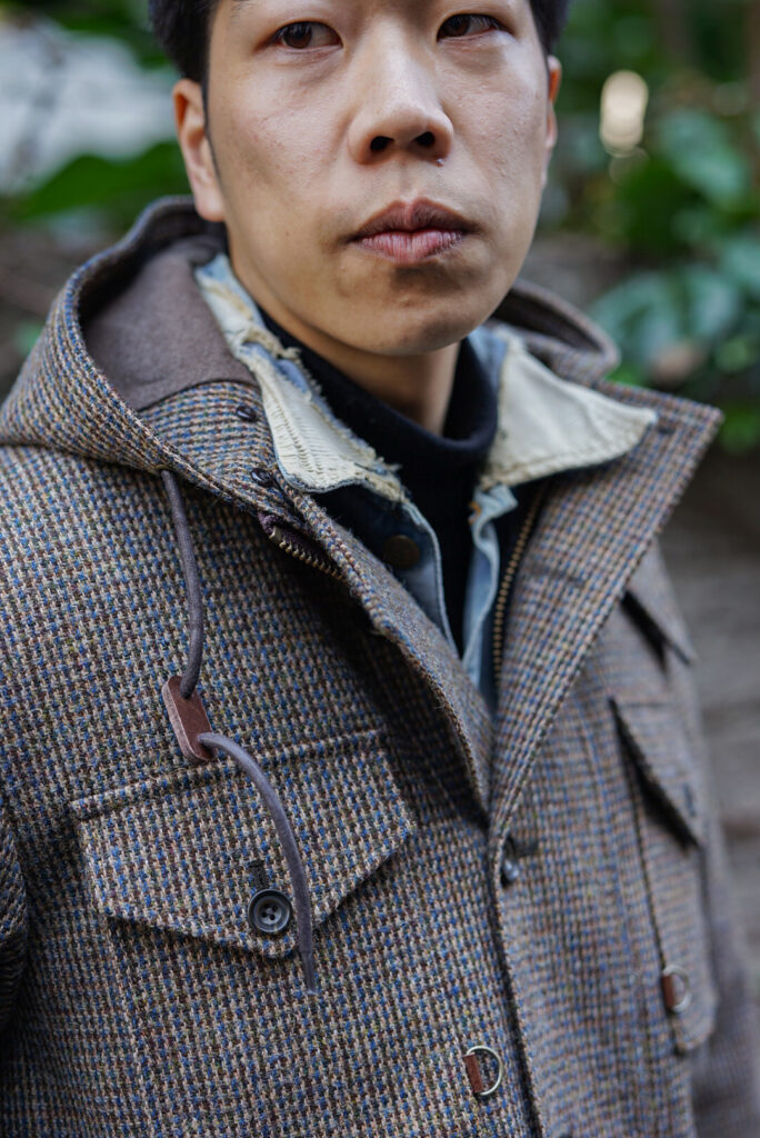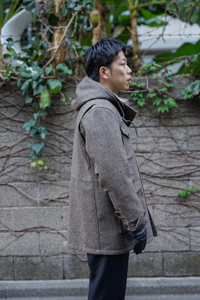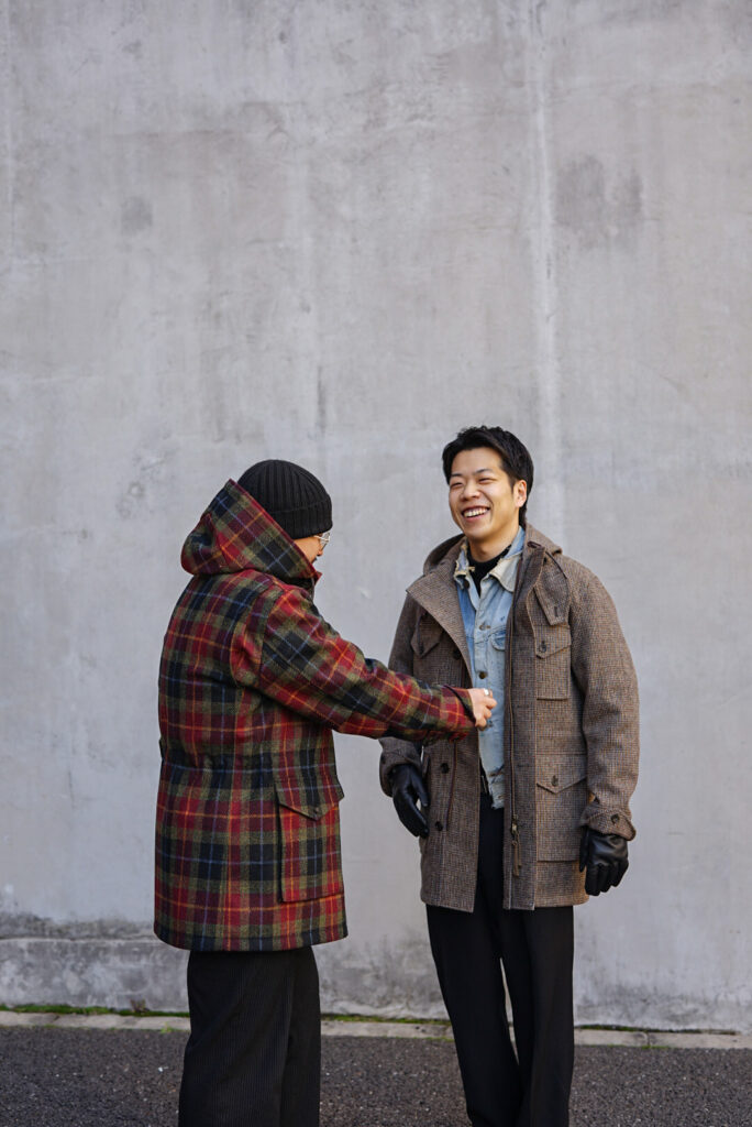 『山下さん、来年の雪山にはGEORGE’S COAT”を着て行きたいんだけど、防寒性が高いGEORGE’S COATがあれば欲しいな〜。おもて面はオーセンティックなツイードだけど、ある程度の防寒性と撥水機能があり、蒸れなくて保湿性があるのがイイよね!とにかく雪山は寒いから、首まわりや手首もガッチリ閉まる仕様で、着丈も少し長めだと有り難いんだけど。