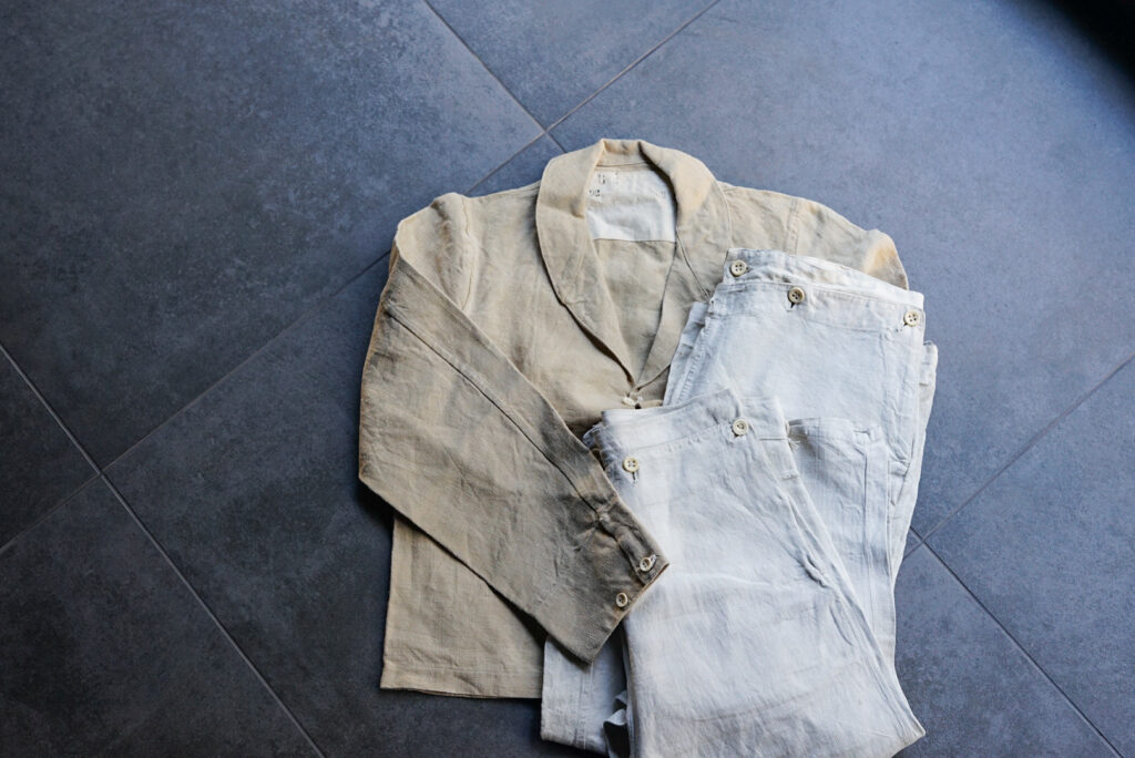 しなやかながらも肉厚なリネンは、日本の高温多湿な夏場でも快適かつタフな素材なのでケアしながら長くご着用頂けます。