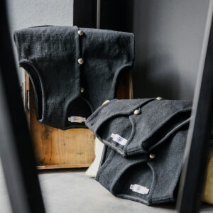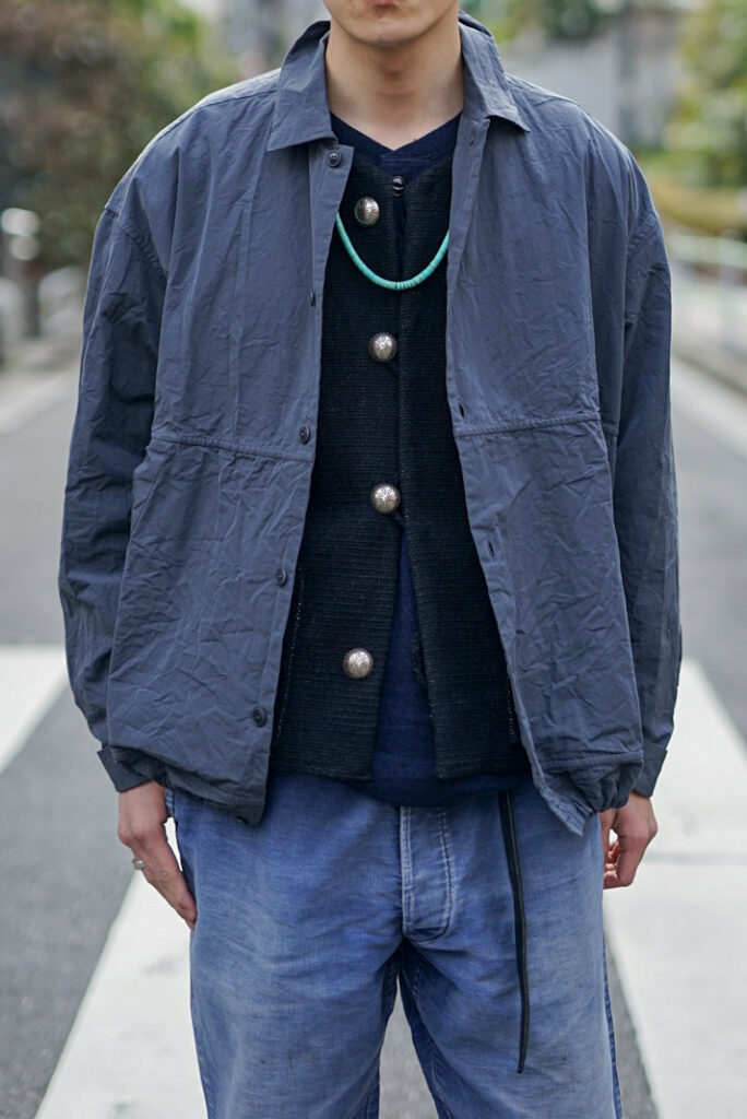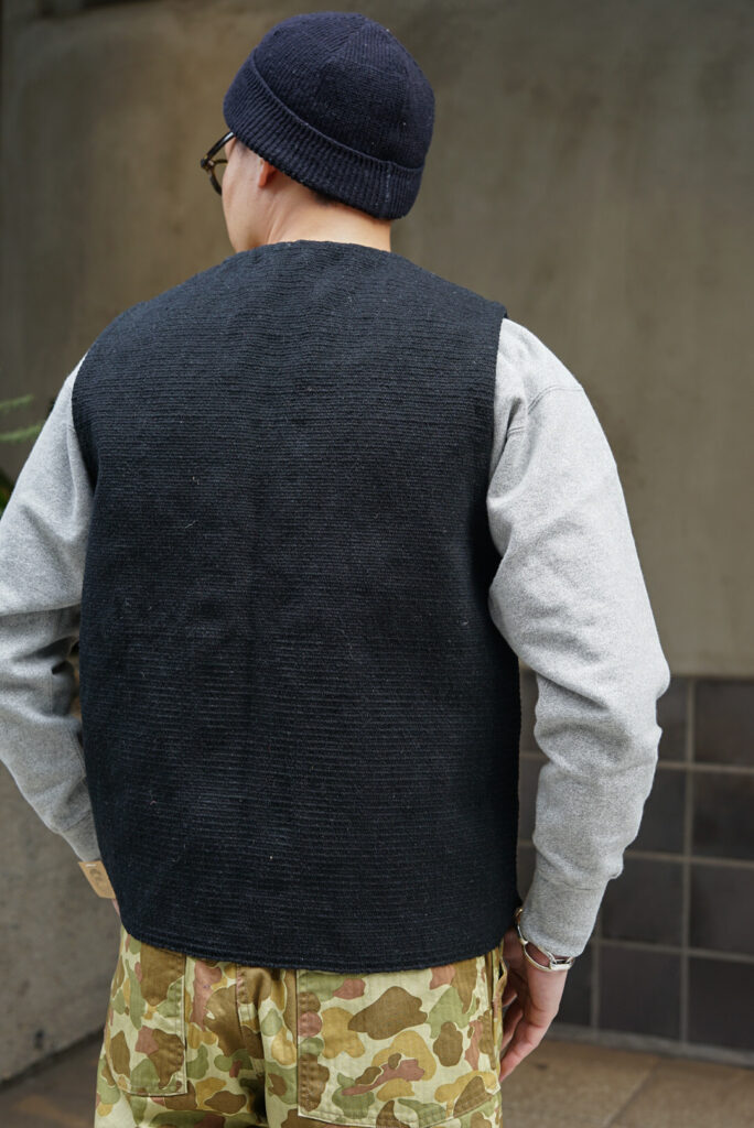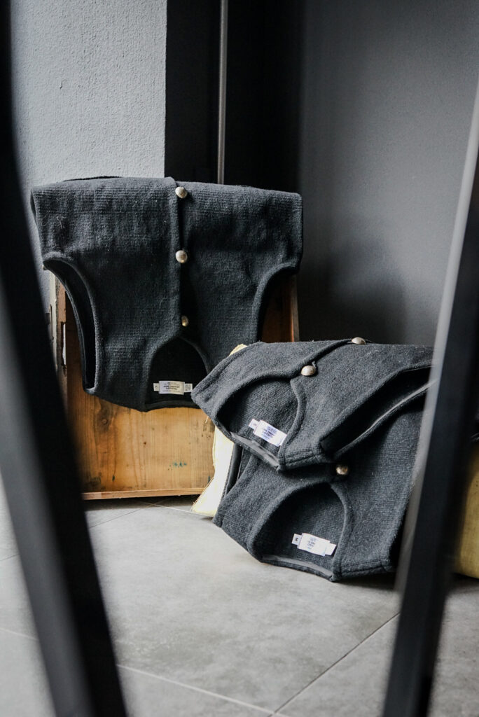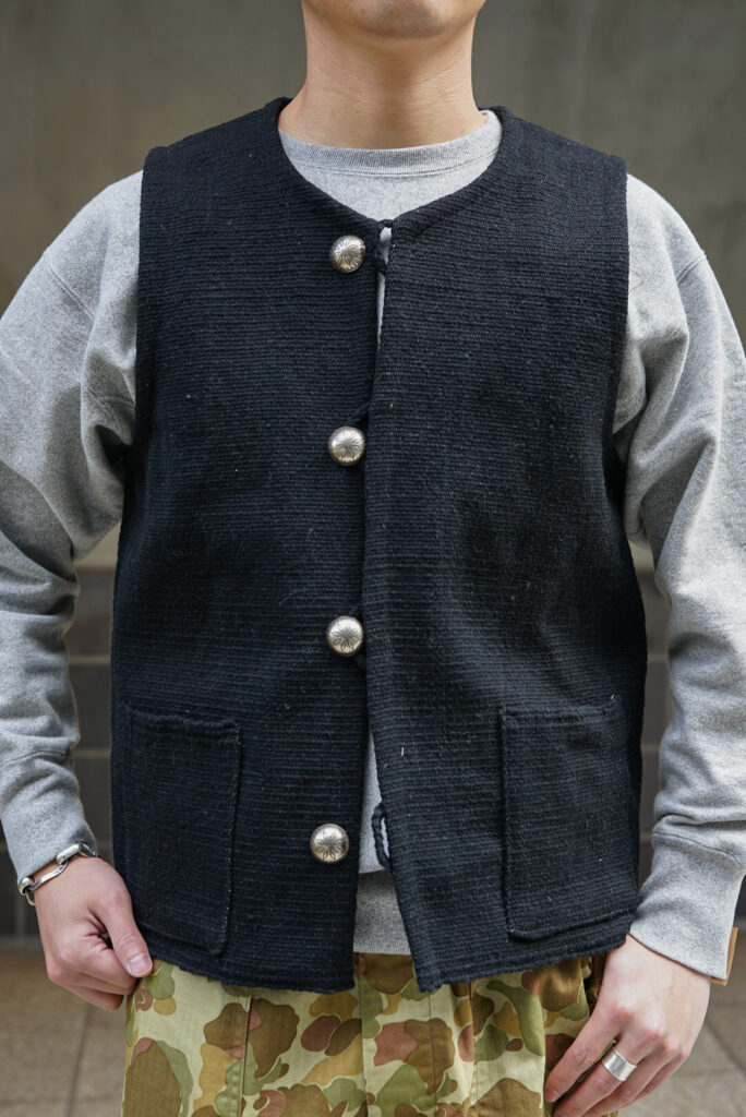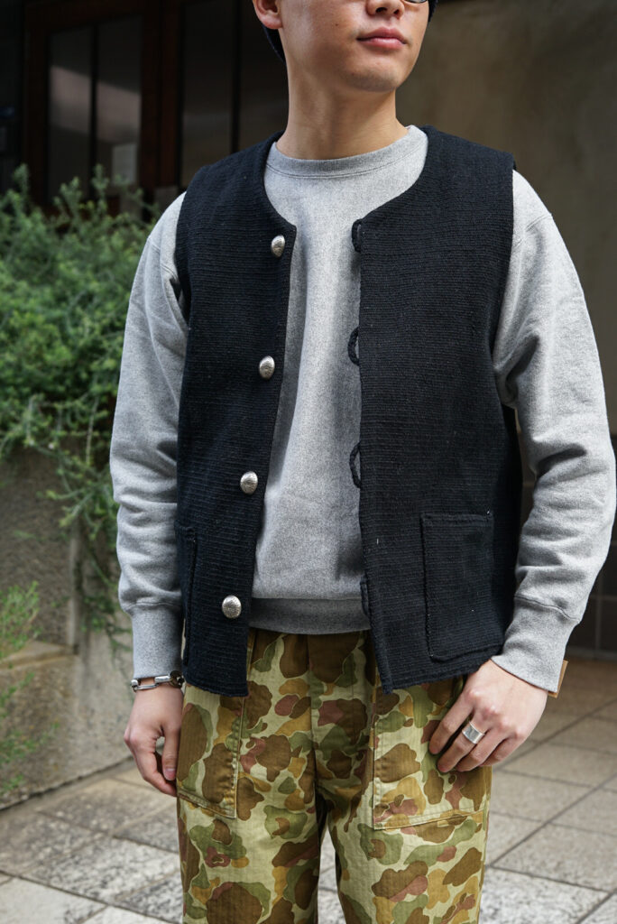 一般的なチマヨベストは、正面や背面にダイヤモンド柄があしらわれていたり、ネックもV字に開いたジレっぽいデザインのものが多いですが、僕たちはあえて単色の黒色かつネック位置を高めたラウンドクルーネックに近い形での別注を依頼しました。