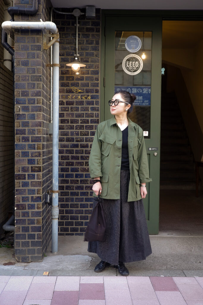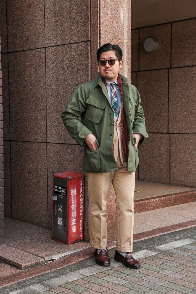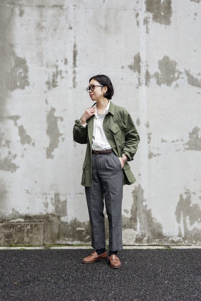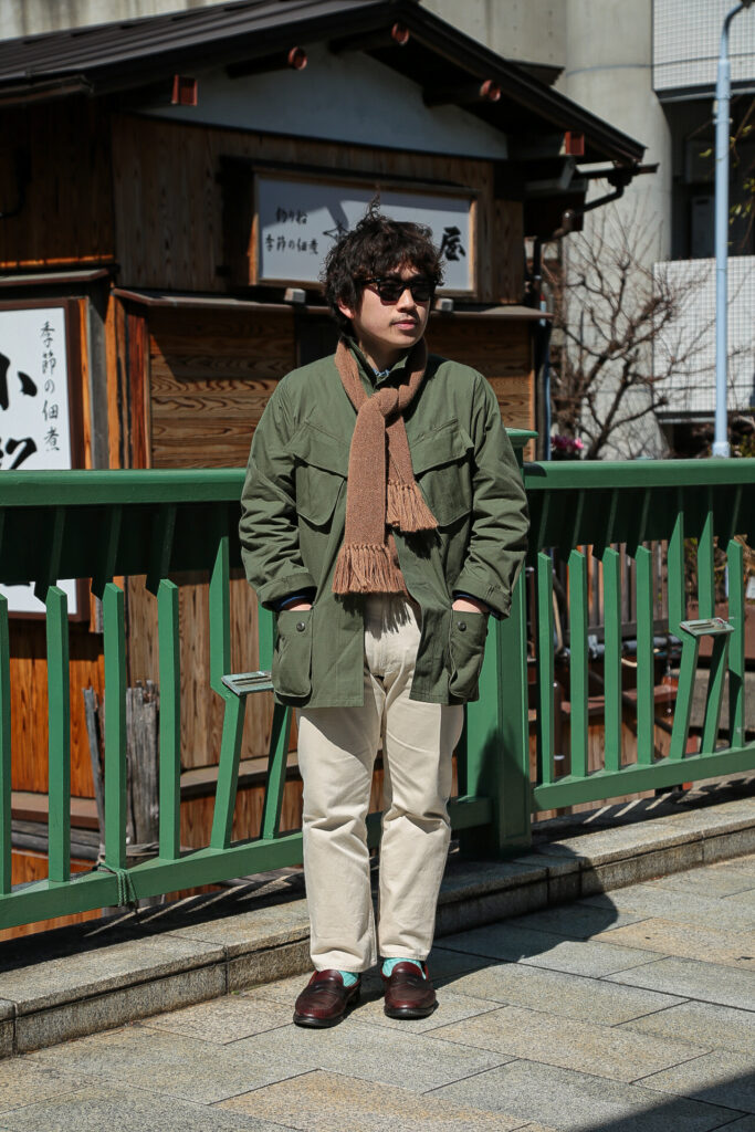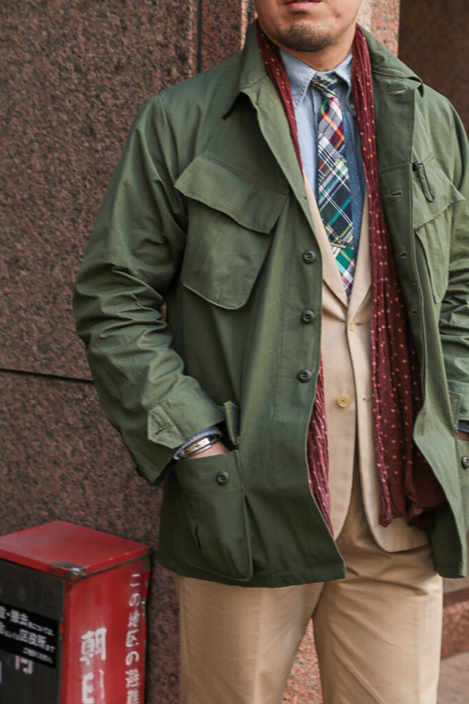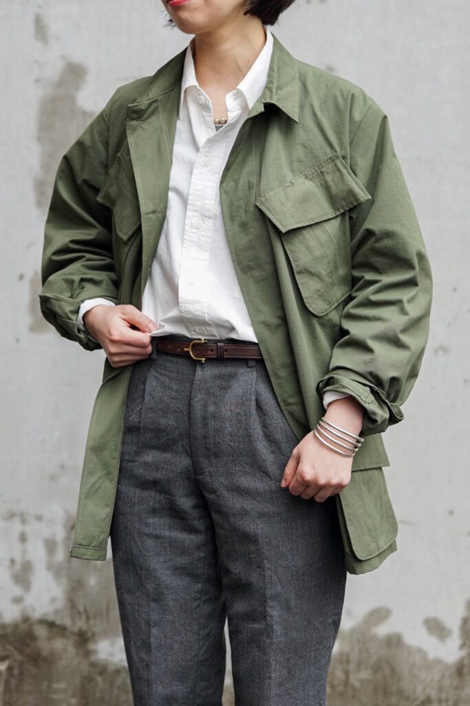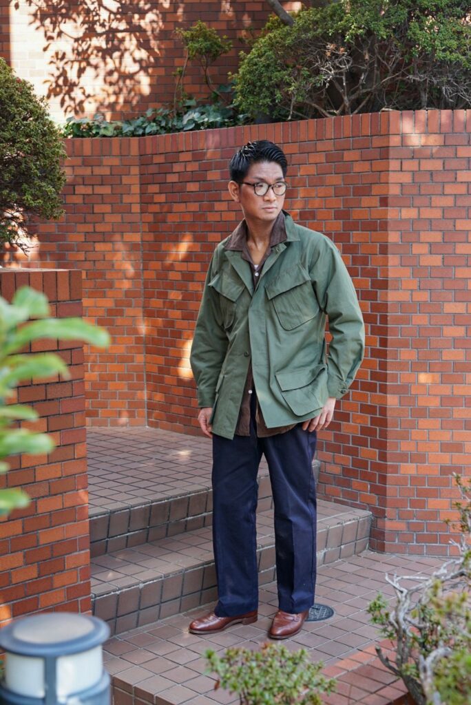 このJUNGLE FATIGUE JACKETのコーディネートを組んでもらいました。