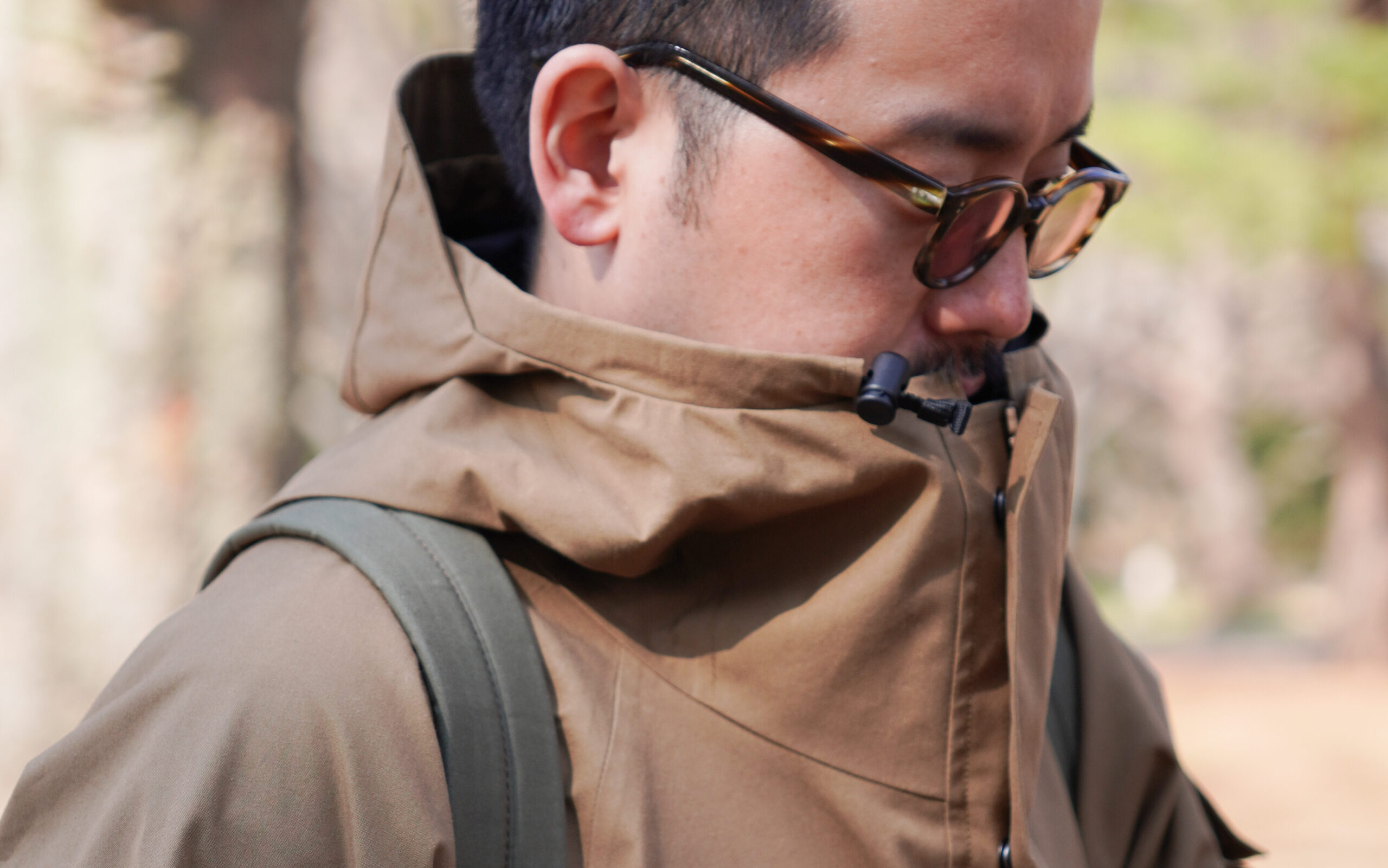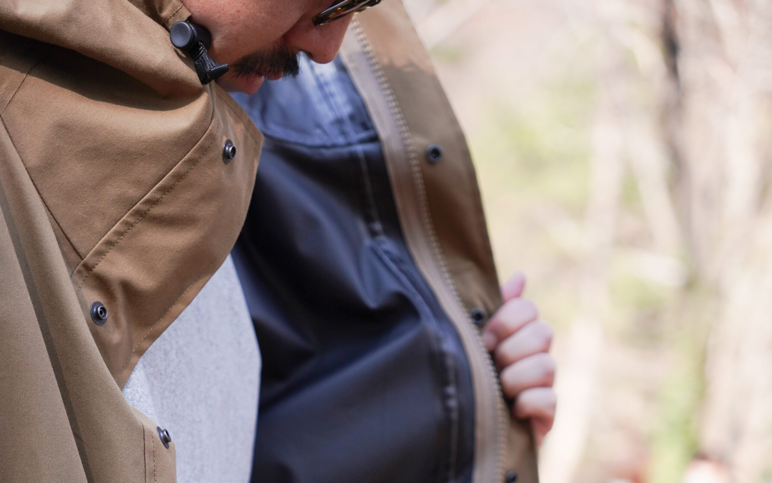 これにより、見た目(表地)はコットンの質感を感じさせるクラシックな風合いでありながらも、ギアのような防水スペックを持たせることに成功。
