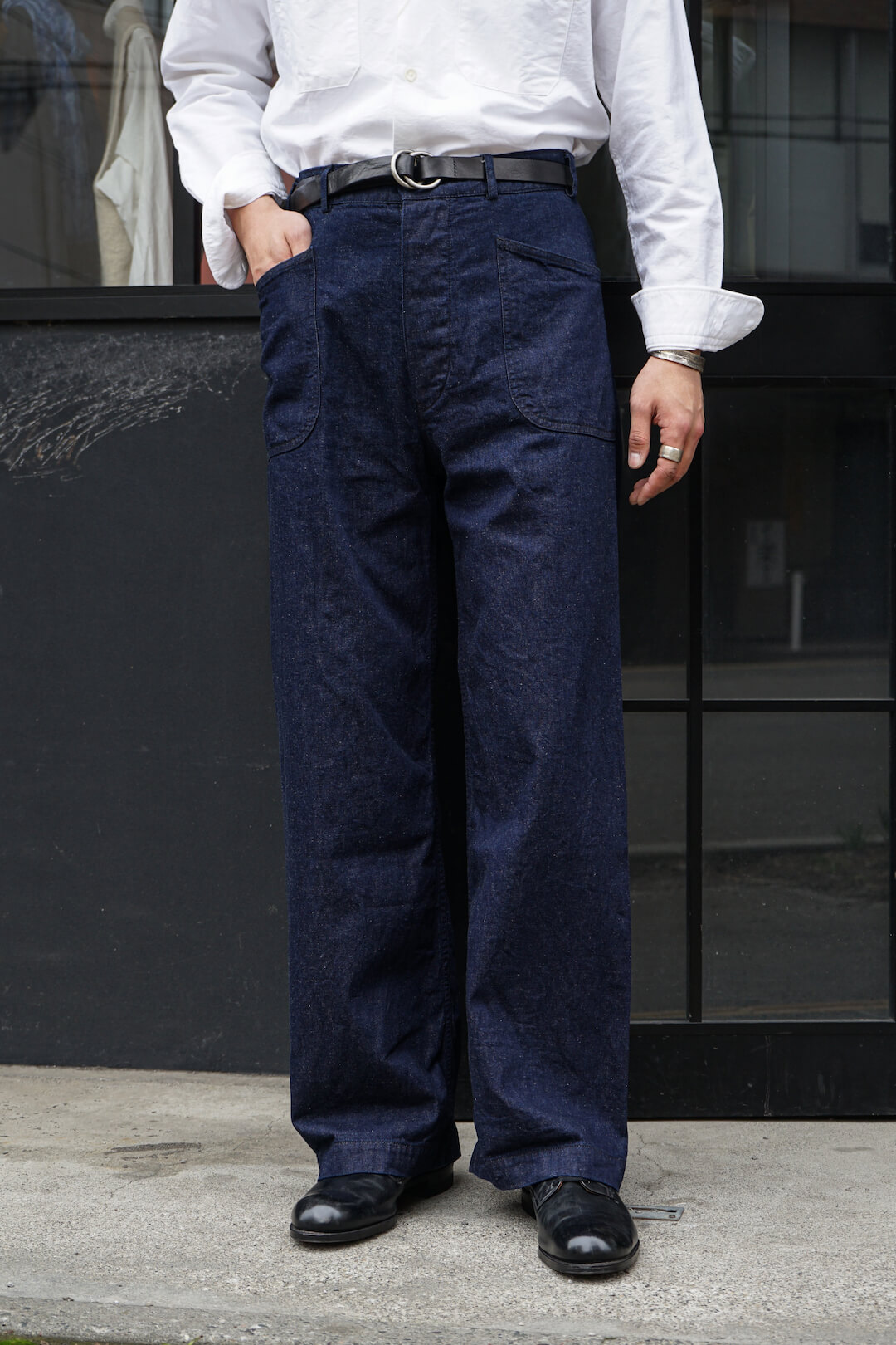40年代アメリカ海軍の巻きパンツ(シームレスパンツのことを指す)をデザインソースに、今回のために製作されたボンクラオリジナルのコットンリネンデニムで仕立てた「真夏に履けるデニム」。