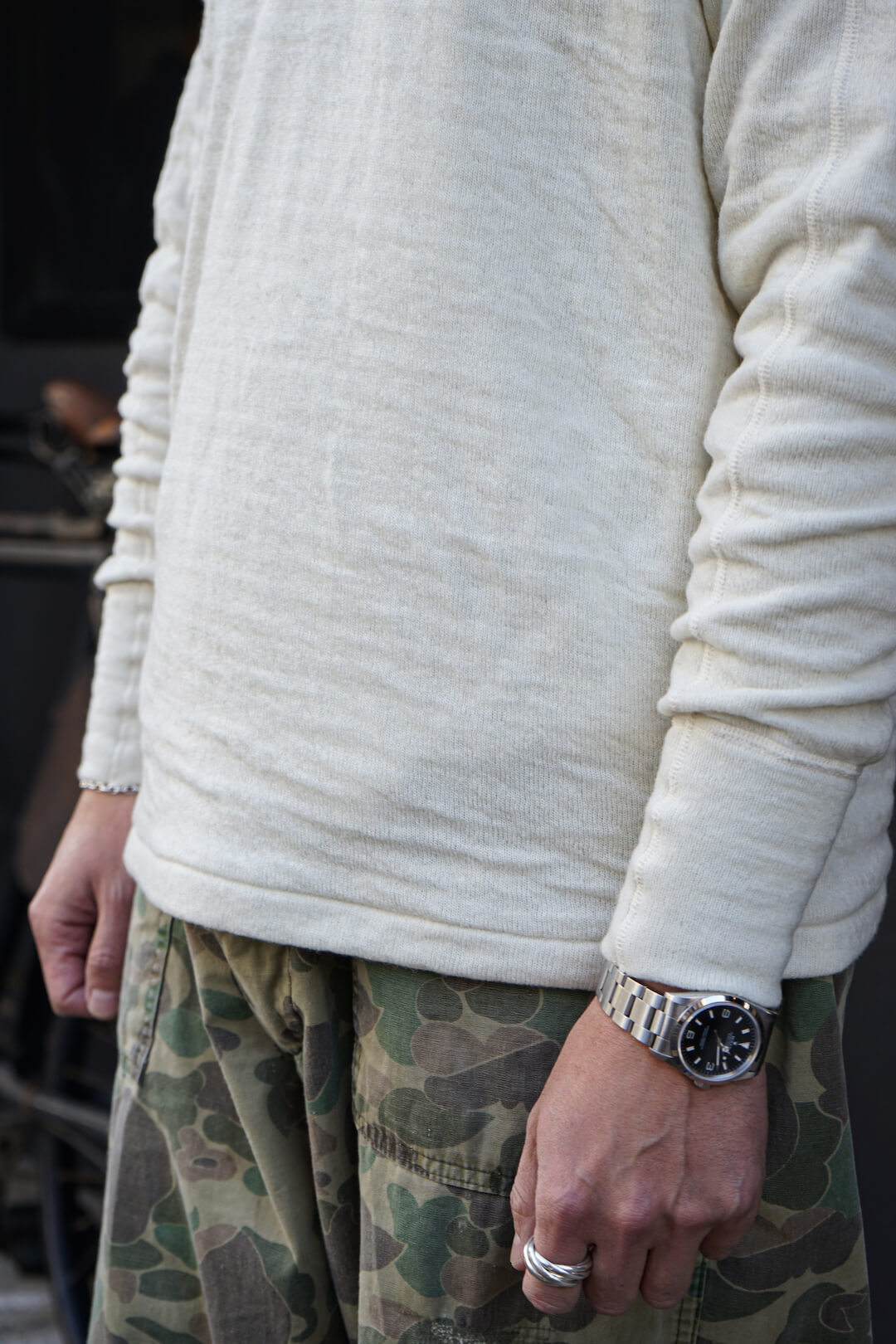 首元のデザインはUS ARMYのヘンリーネックアンダーシャツがベースとなっており、前立て裏のヘリンボーン生地を襟芯にも使用することで、着用を重ねても首元がへたらないように考慮しています。