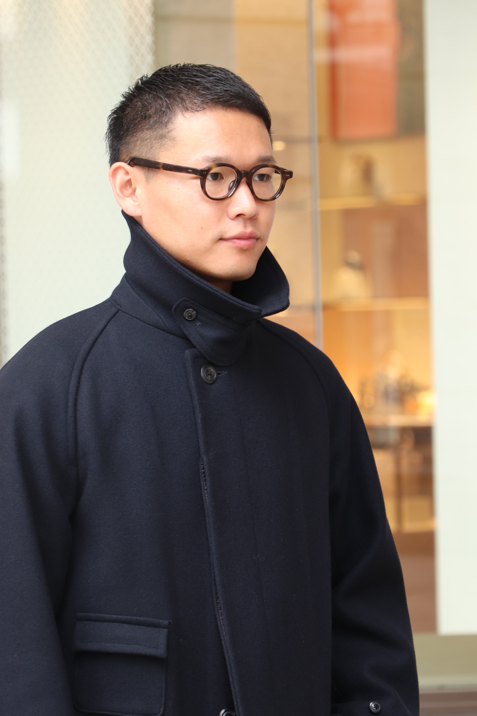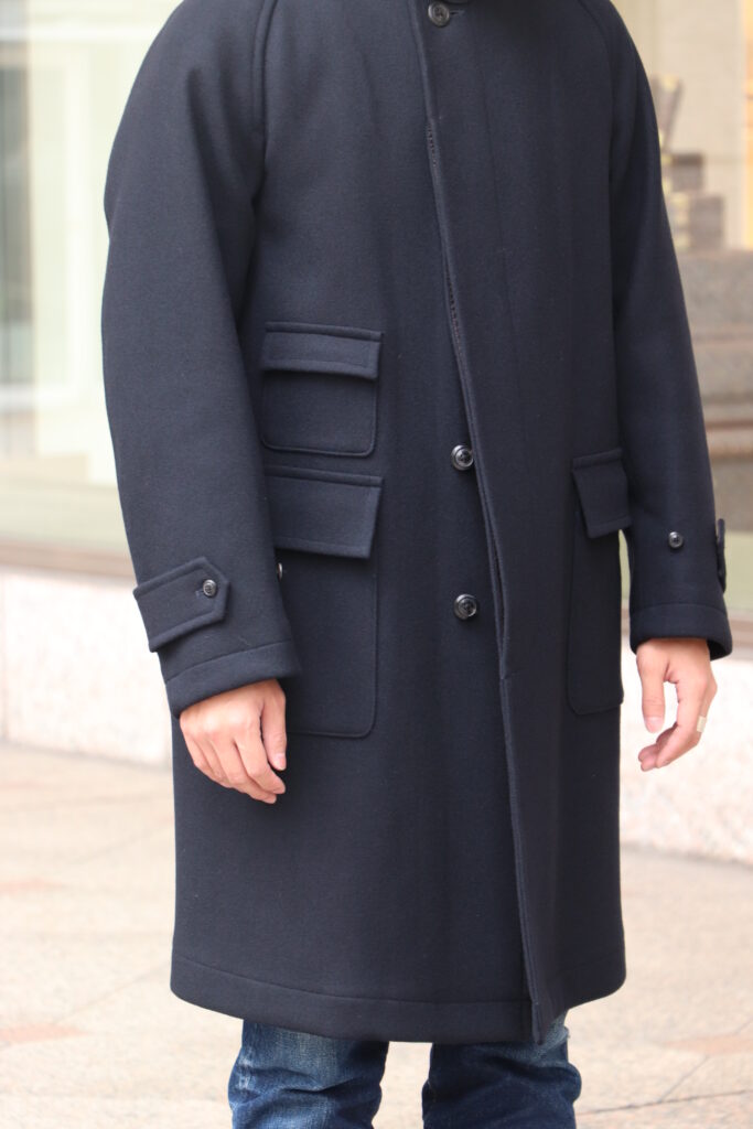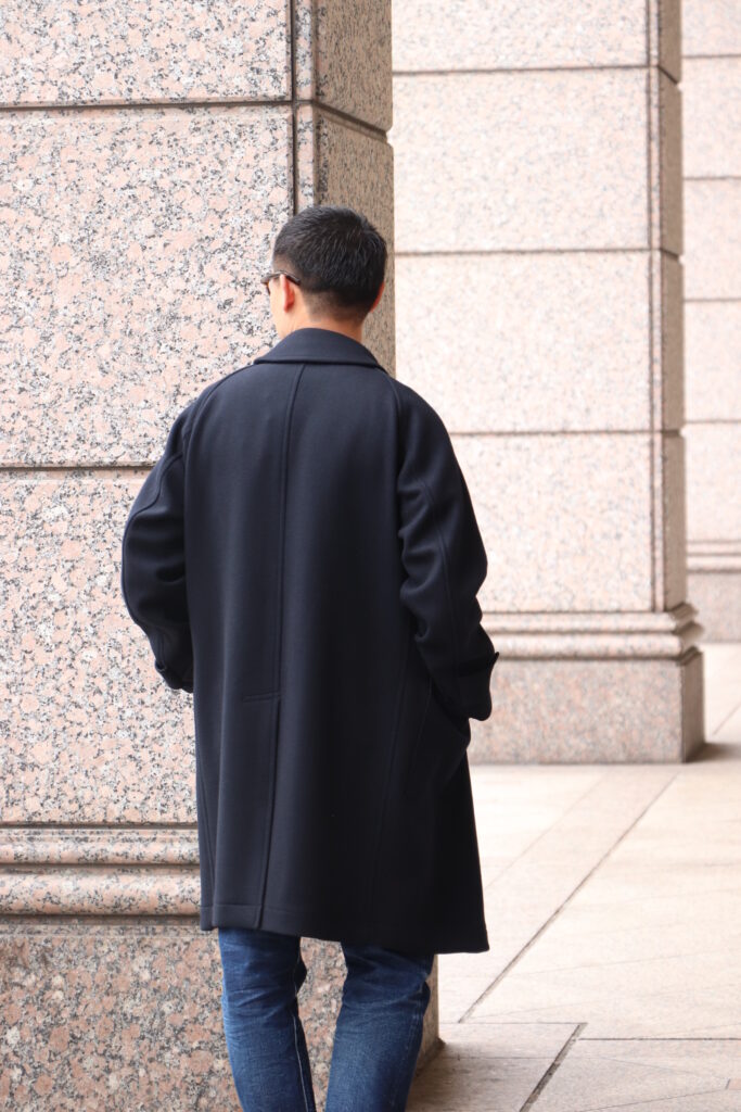 通常のメルトンコートだと、「重たい」「着づらい」などと懸念されることが多いですが、計算されたパターンも相まって最高の着心地。着用した時に綺麗にドレープしてくれます。