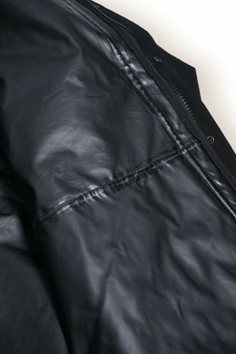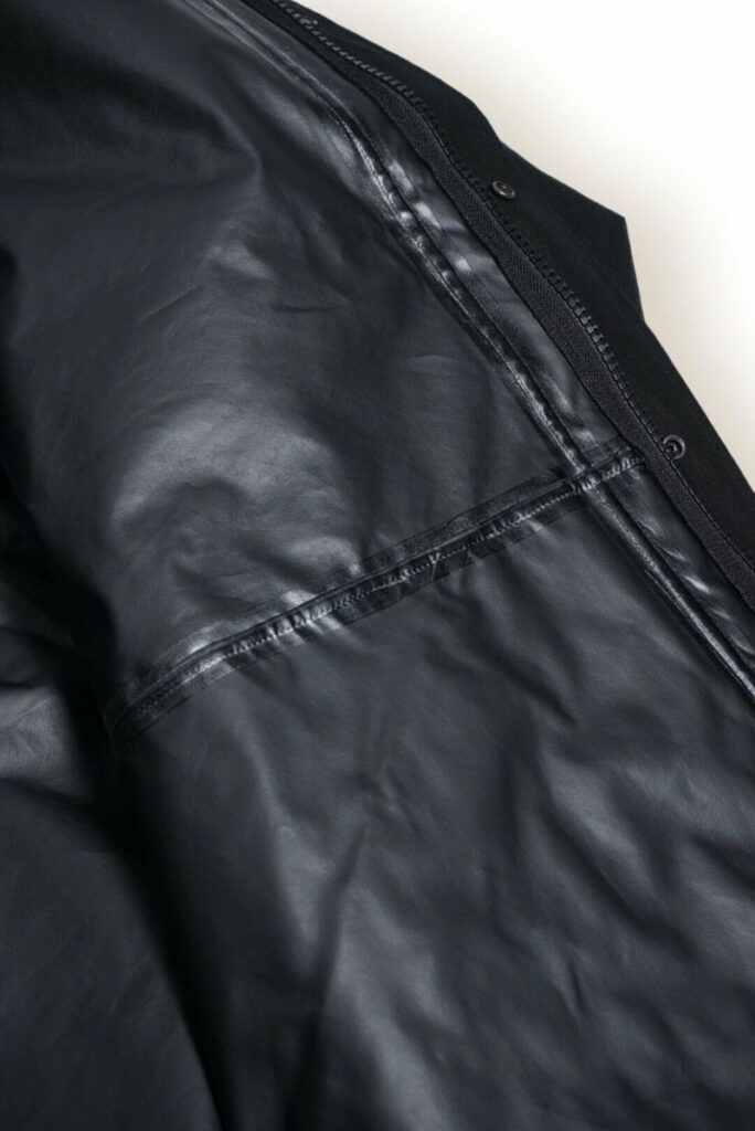 その80/20クロスに、日本の高い技術力を用いて超撥水加工を施し、生地の裏面にはレインウェアなどに使用される防水シートを貼り合わせ、さらにその上からメンブレン加工を施すことで、80/20クロスのクラッシックなミリタリーウェアとしての雰囲気や経年変化を楽しみながら、タウンユースからアウトドアシーンに至るまで、防水スペックを最大限引き上げた、MSG&SONSにしか生み出すことのできないであろう1着。