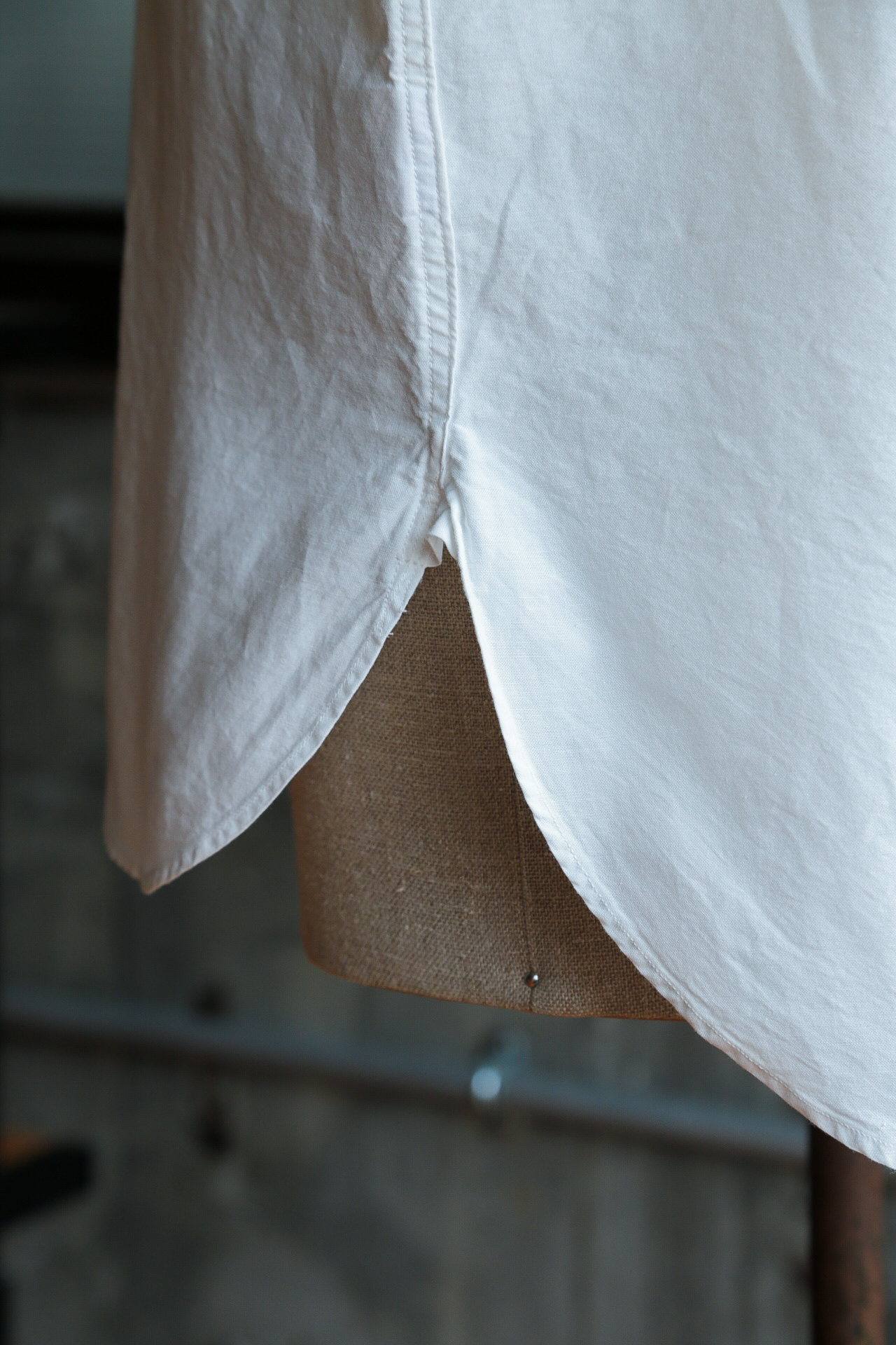 裾のピッチの細さも特徴的で、ドレスシャツに用いられる綺麗な仕様で、脇下から裾にかけては、二本針で縫えるミシンで縫製しています。