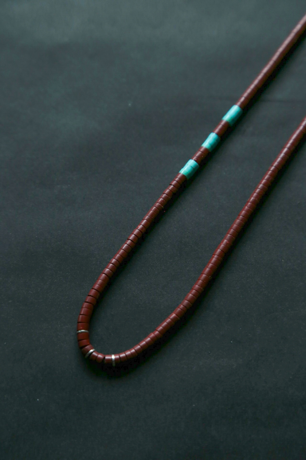 太田氏のビーズへの長い探求から出会った、インディアンジュエリーの巨匠Calvin Lovato氏とのヒシネックレス、同氏の家族で一つ一つ手作業で製作され、