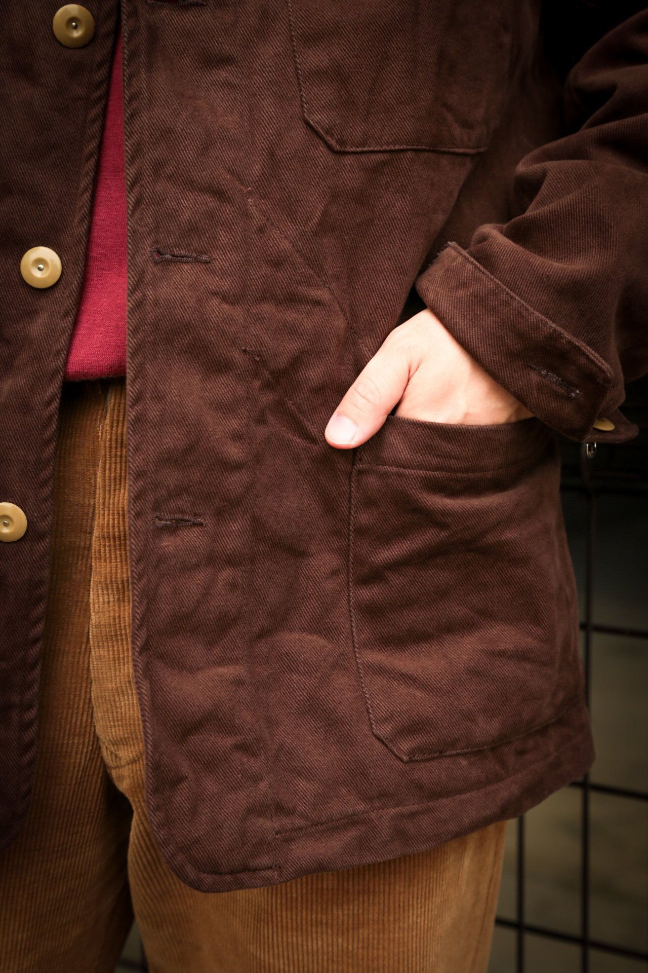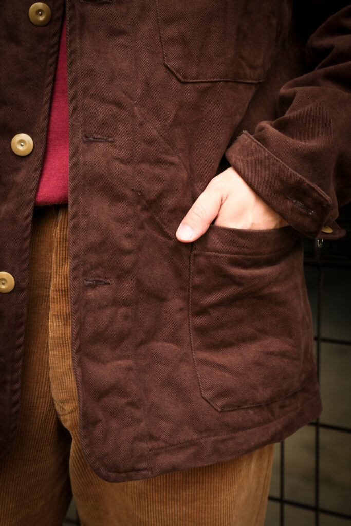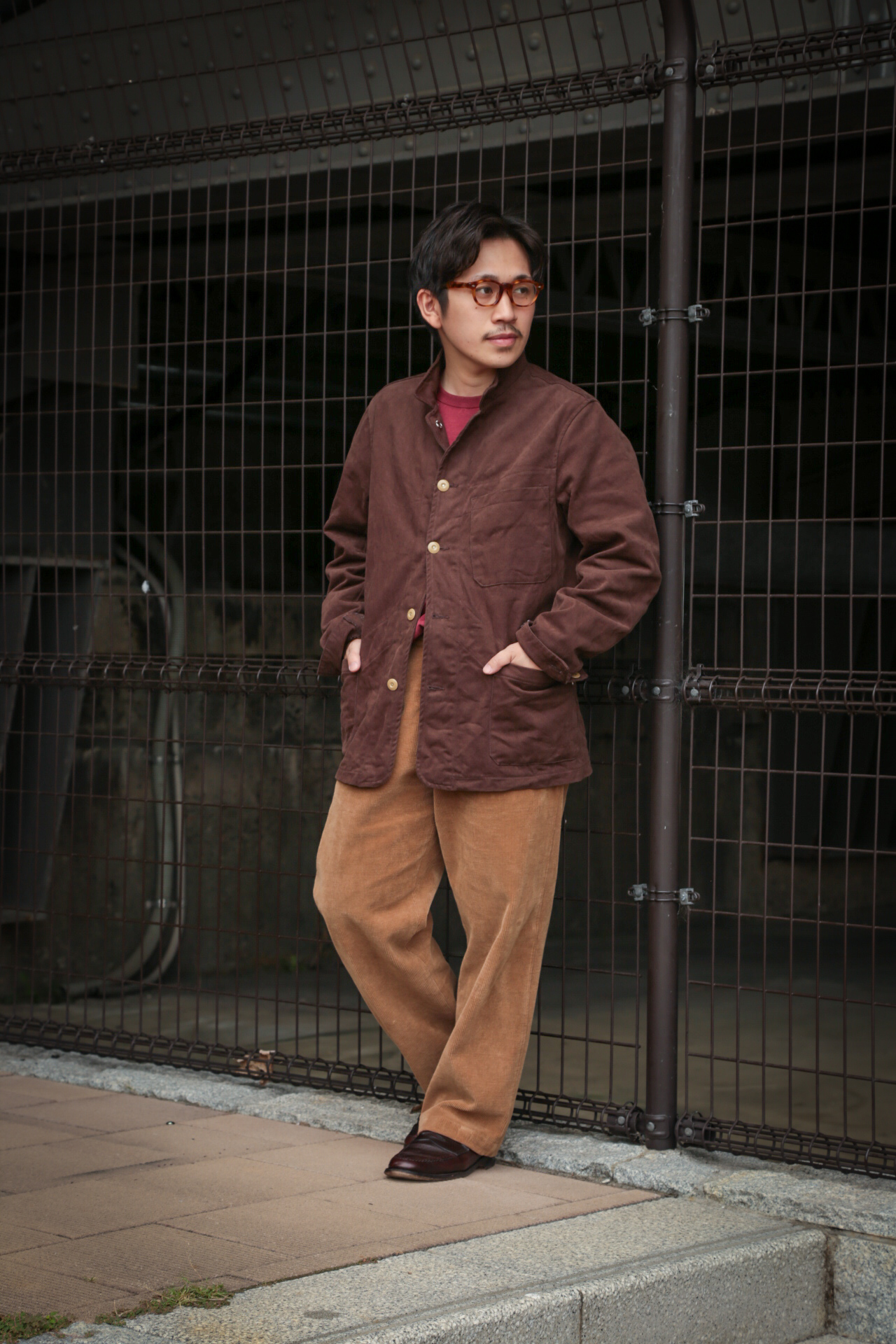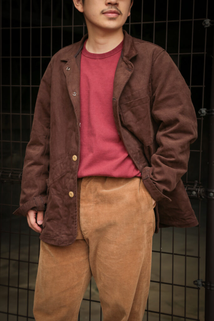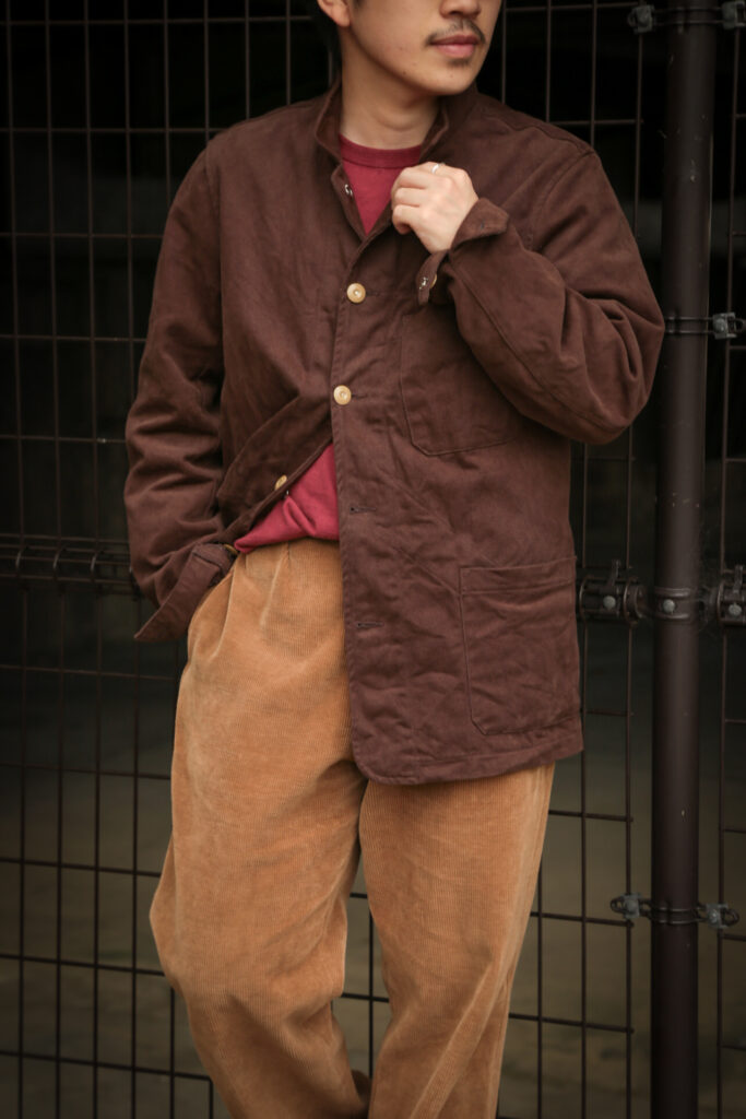 頑丈なツイル素材にスタンドカラー、前振りの袖付け、立体的なパターン。