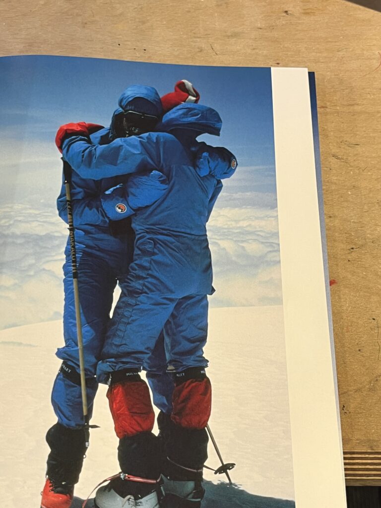 雲より高い真っ青な空の下、真っ白な雪に映える、真っ青なダウンジャケット。