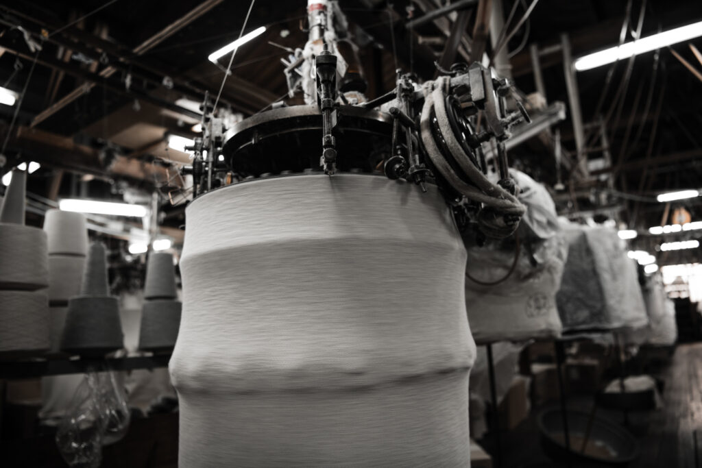 旧式の吊り編み機でゆっくりと編まれる生地はモチっとした弾力に加え、