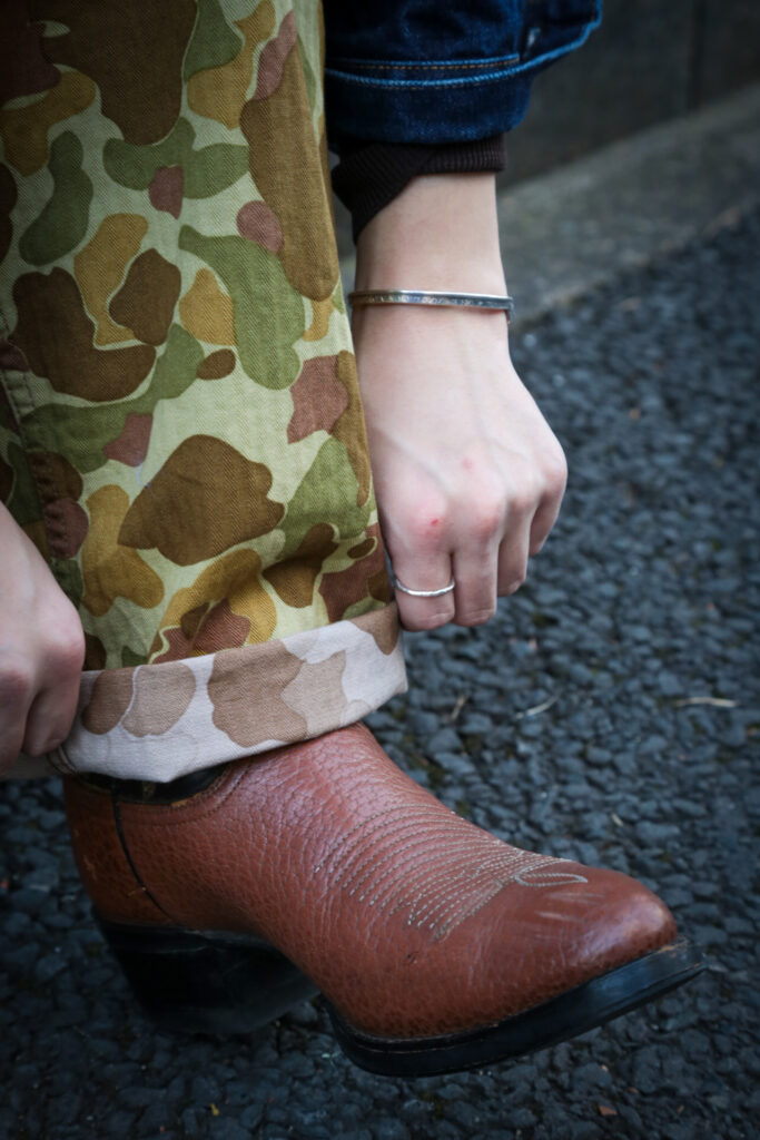 ちょうど、森島氏はオリーブヘリンボーンのベイカーパンツを着用されていました。
