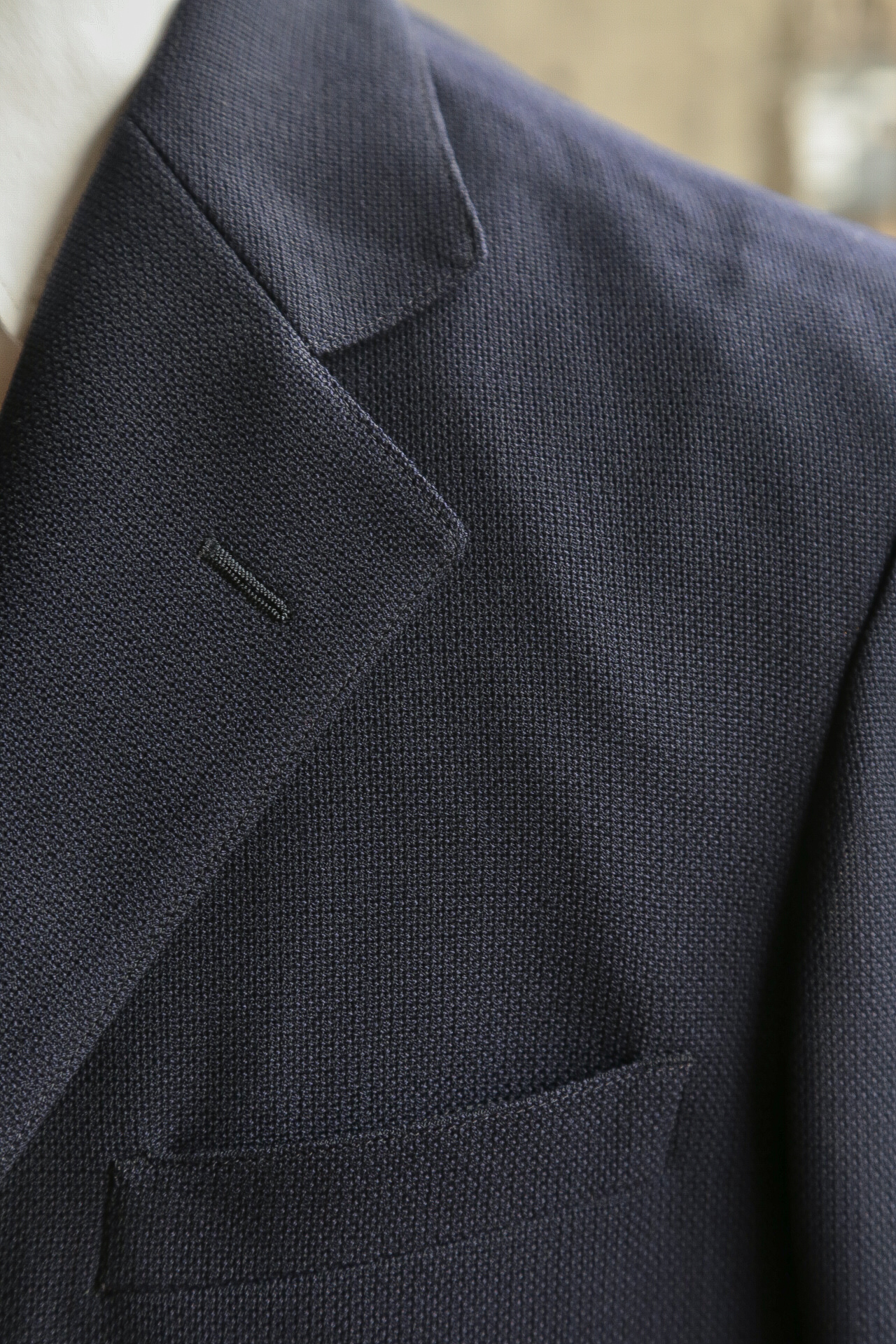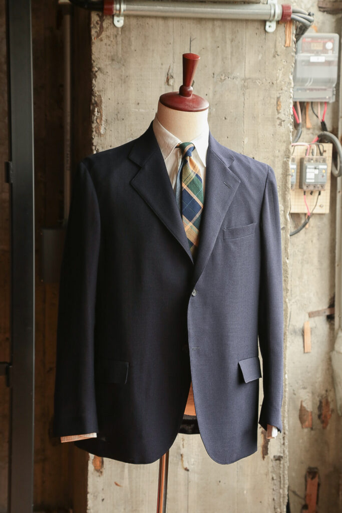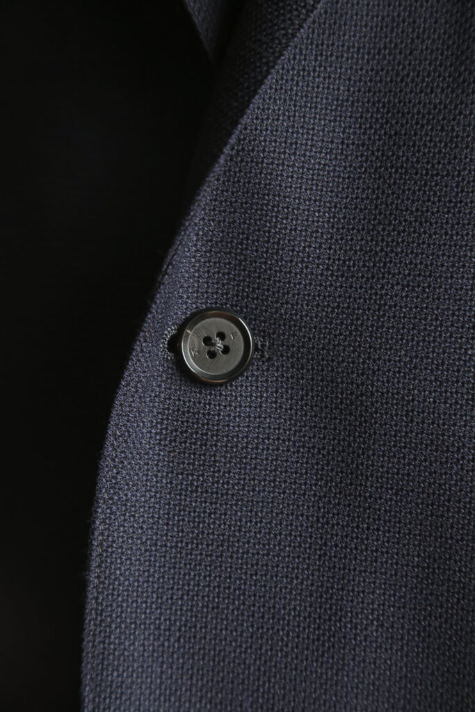 深いネイビーに控えめな生地の光沢、ウール素材のホップサックならではのしなやかな生地と気持ちの良い肌触りが特徴です。