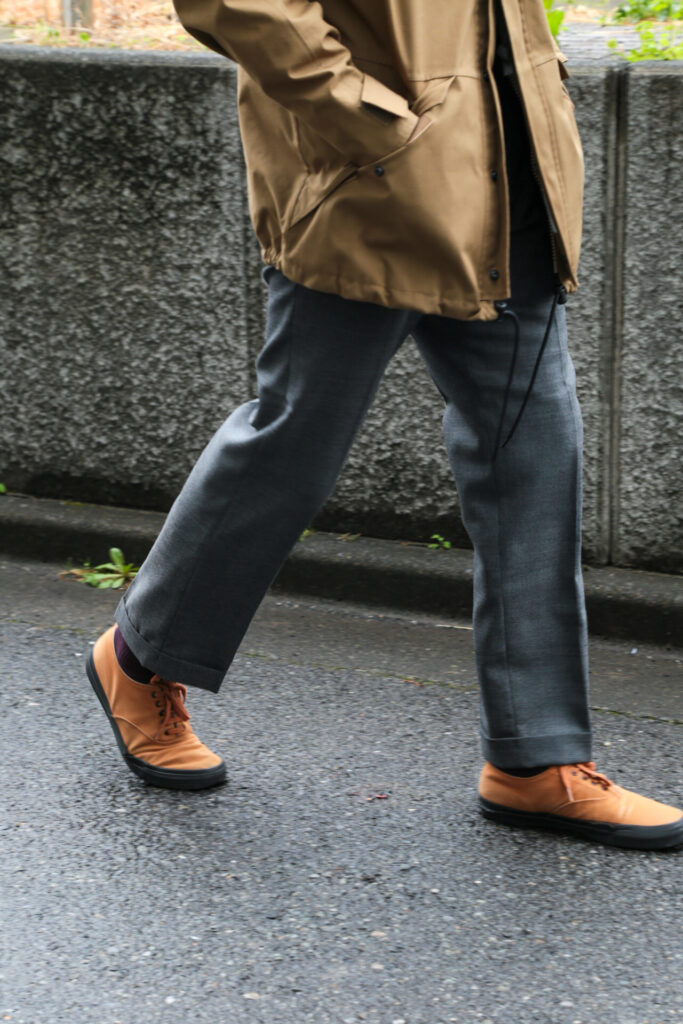 これまでケネス フィールドが提案していたTRIMもしくは1プリーツよりも全体的にゆとりがうまれる事で、様々なトップスとの繋がりが自然になります。