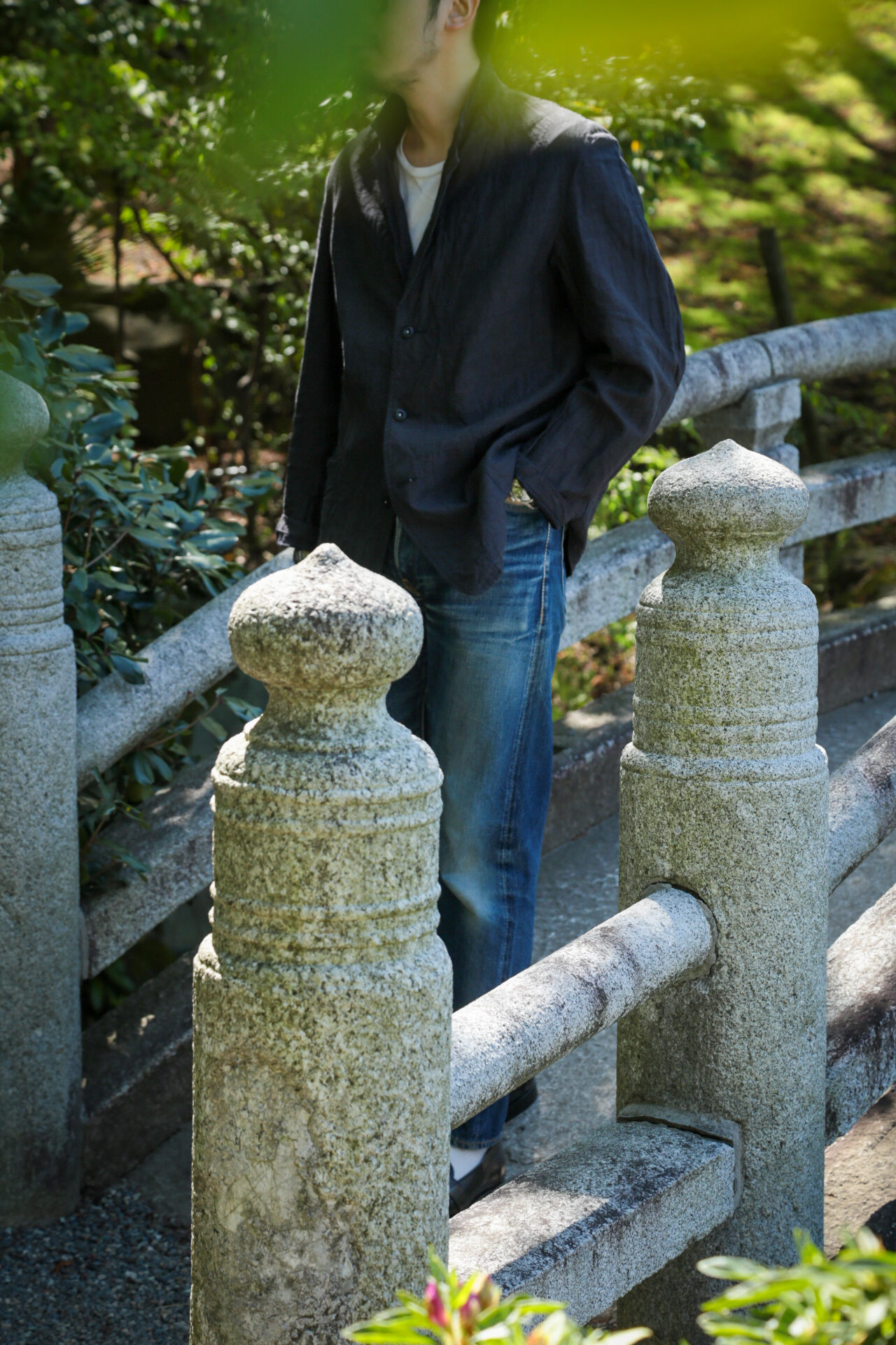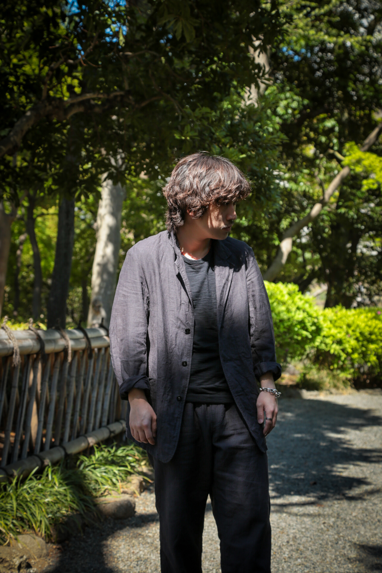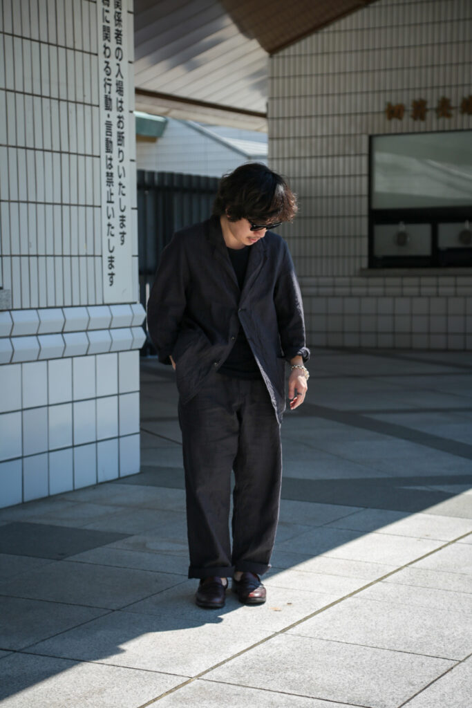 三つボタンのワークジャケットに、ミリタリー由来のディテールを取り入れたイージーパンツのセットアップ。