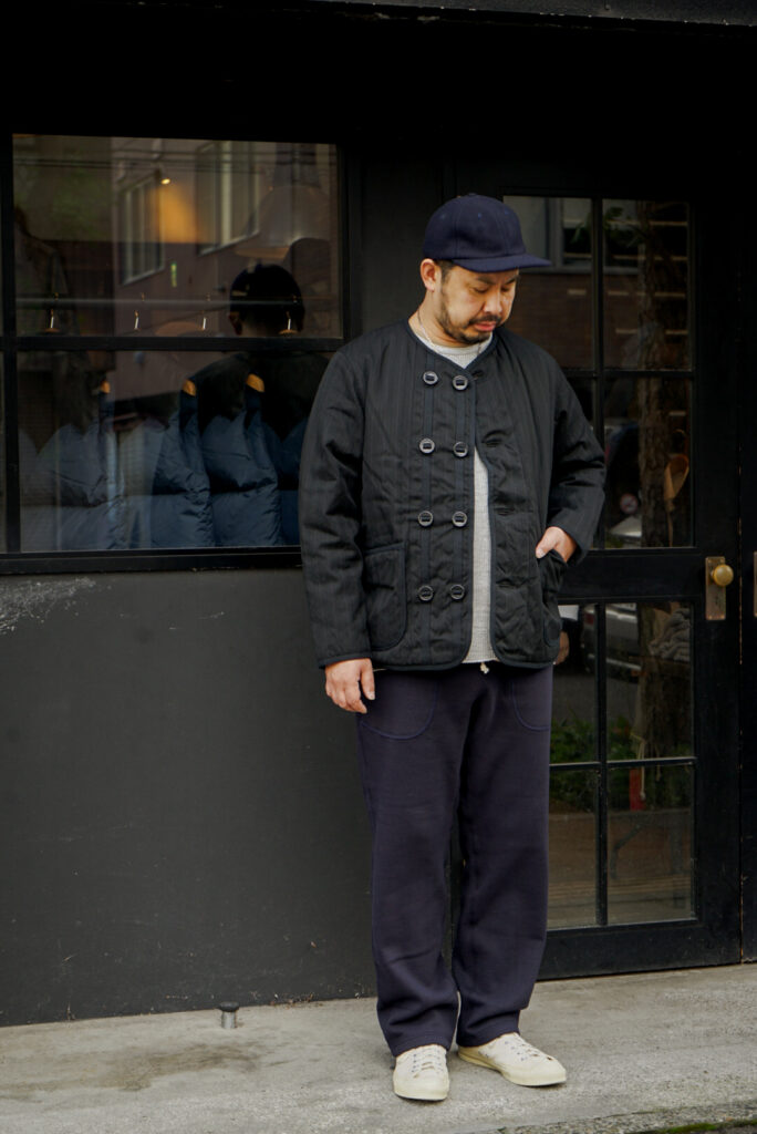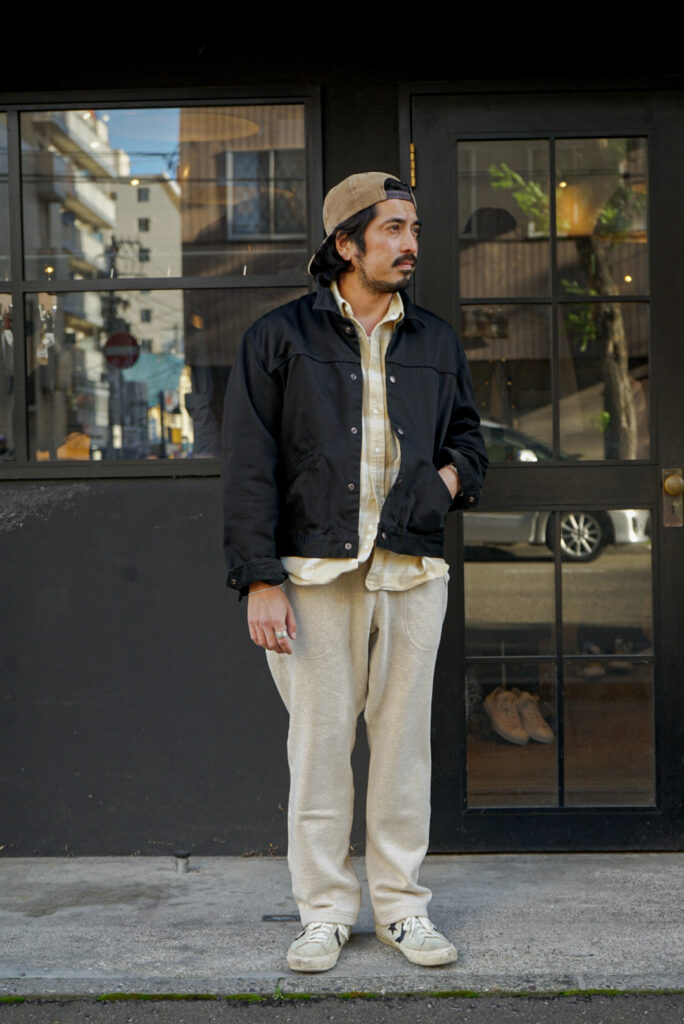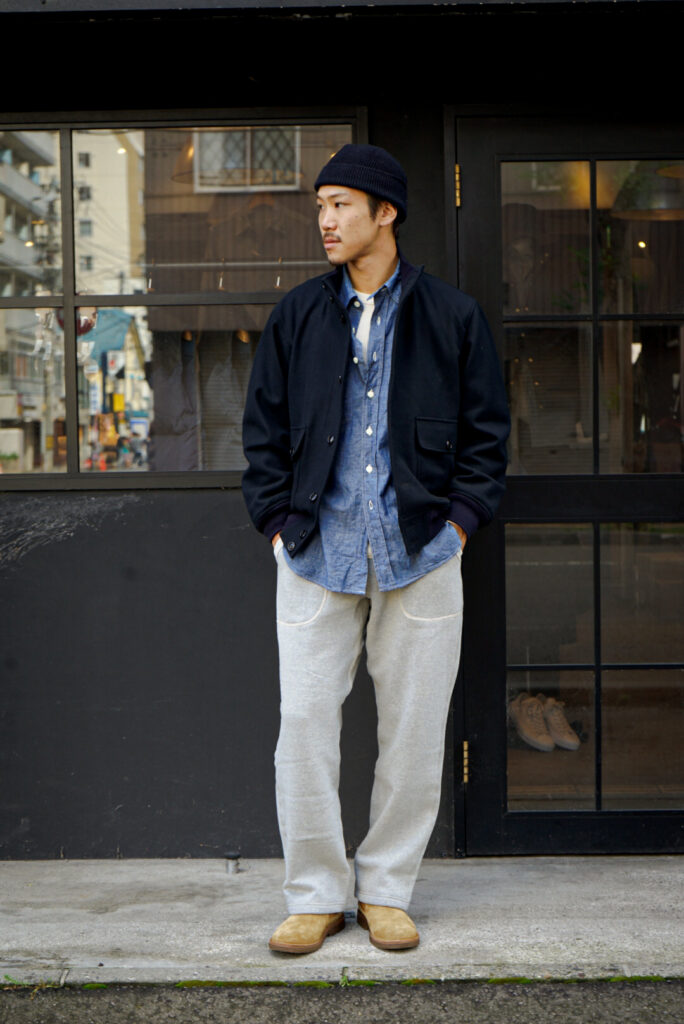 今の季節、Gジャン等のカジュアルなライトアウターでリラックスしたスタイリング、スウェットパンツとは思えない上品さもある佇まい。ジャケットなんかと合わせても良いと思います。