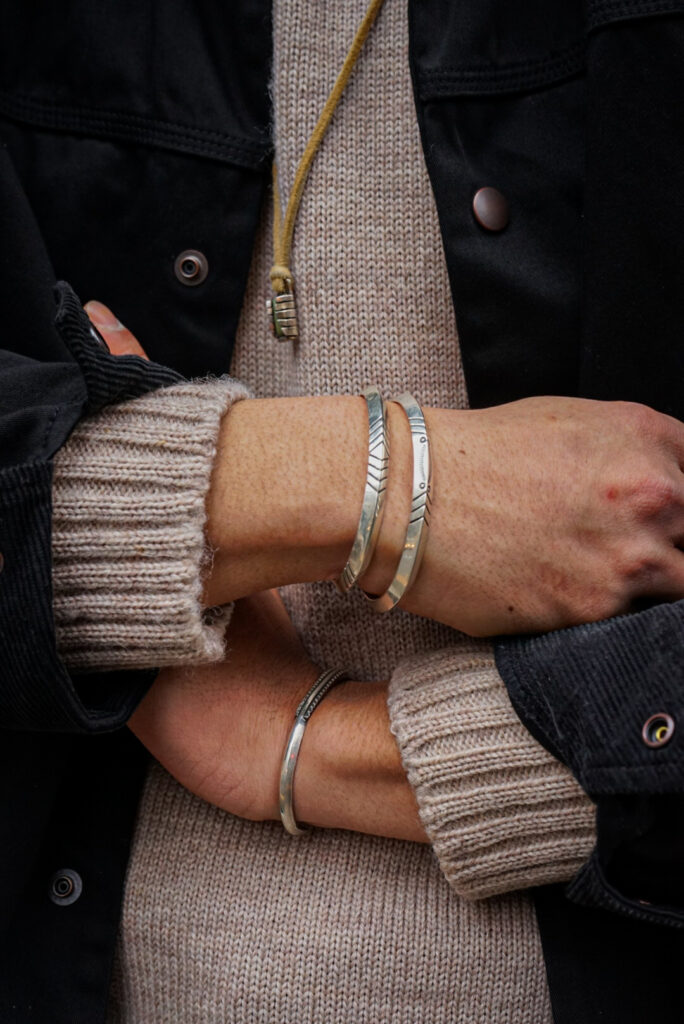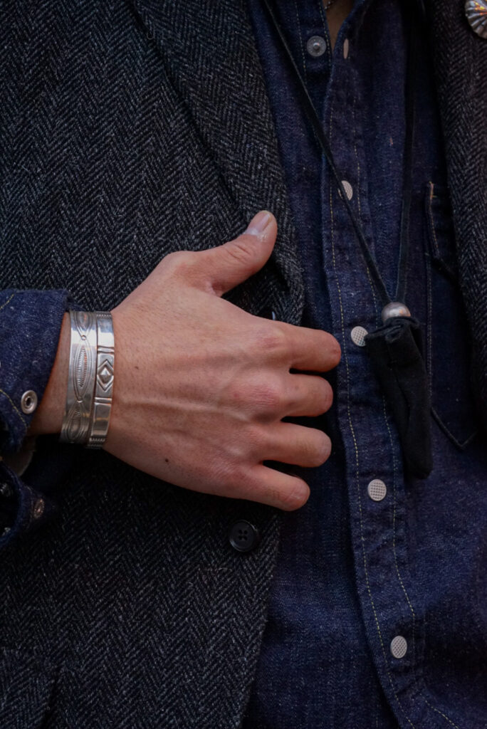 大航海時代にヨーロッパから交易品としてネイティブアメリカンに渡ったトレードシルバーやそれらの影響を受けてたであろう平原部族が得意とするデザインにインスピレーションを得て独自の解釈で制作したバングル。