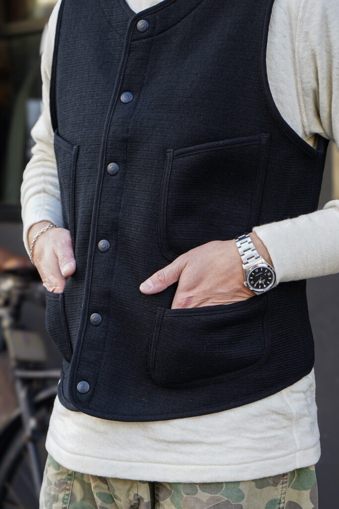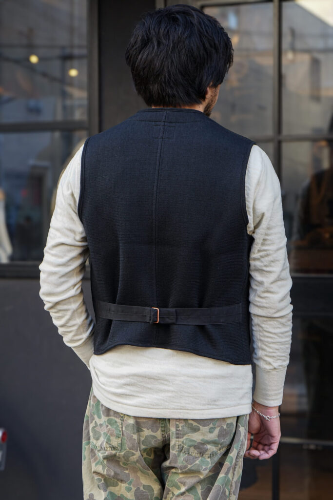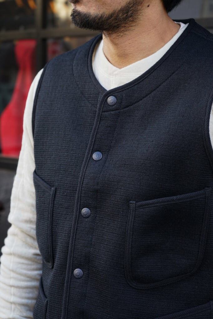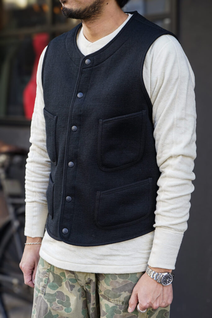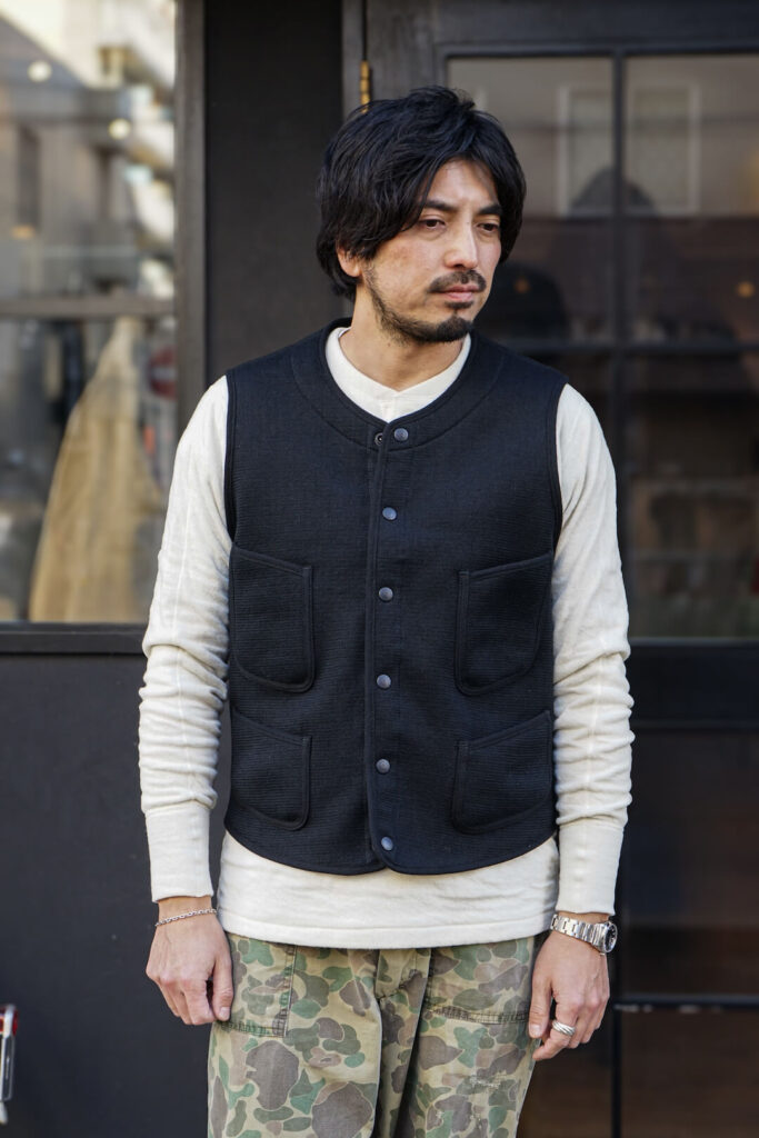 シャツやニットの上には勿論の事、カットソーやフーディの上にも着用して頂ける防寒性も兼ね揃えている名作の一つ”ビーチベスト”
