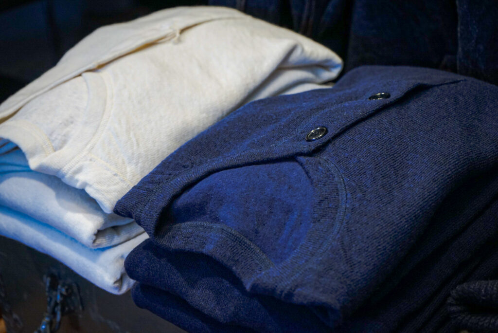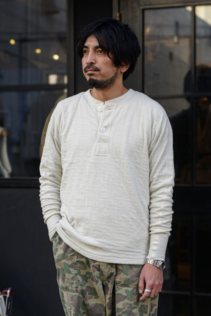 本日のブログでは、古き良きアメリカのアンダーウエアをベースに、1枚での着用もイメージしアップデートを施した、2レイヤーのヘンリーネックカットソーのご紹介になります。