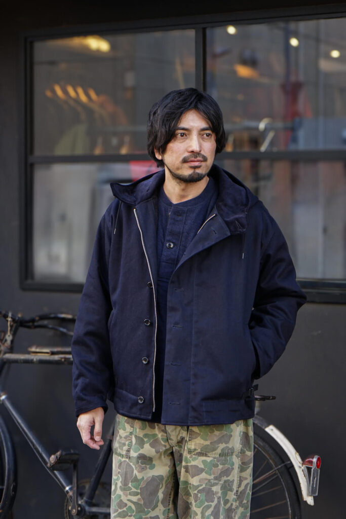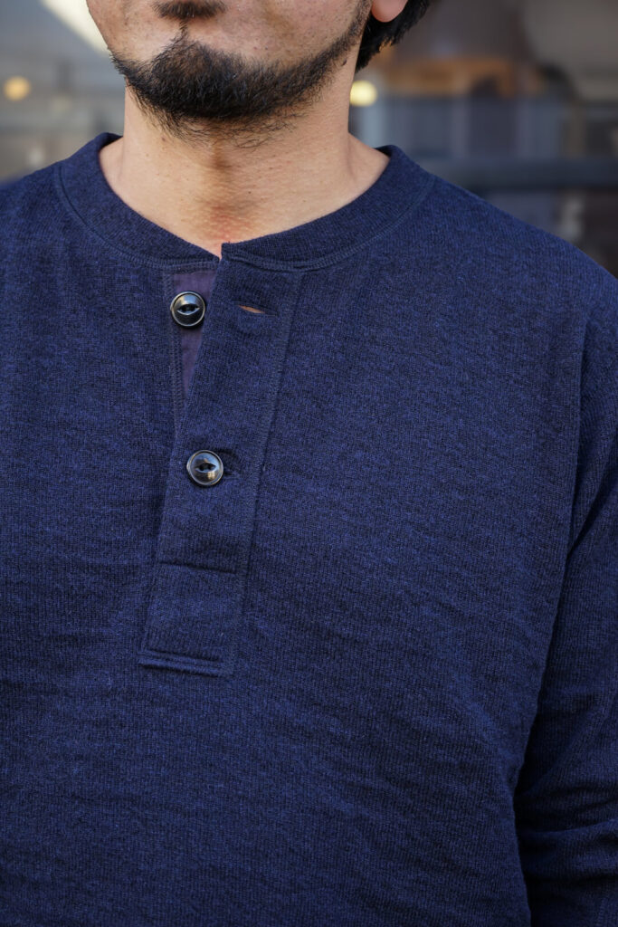 首元のデザインはUS ARMYのヘンリーネックアンダーシャツがベースとなっており、前立裏のヘリンボーン生地を襟芯にも使用する事で、着用を重ね洗いを繰り返しても首元がへたらないようにしています。長く愛用する事を想定すると非常に大切なポイントの一つ。ボタンはビンテージライクなキャットボタン。