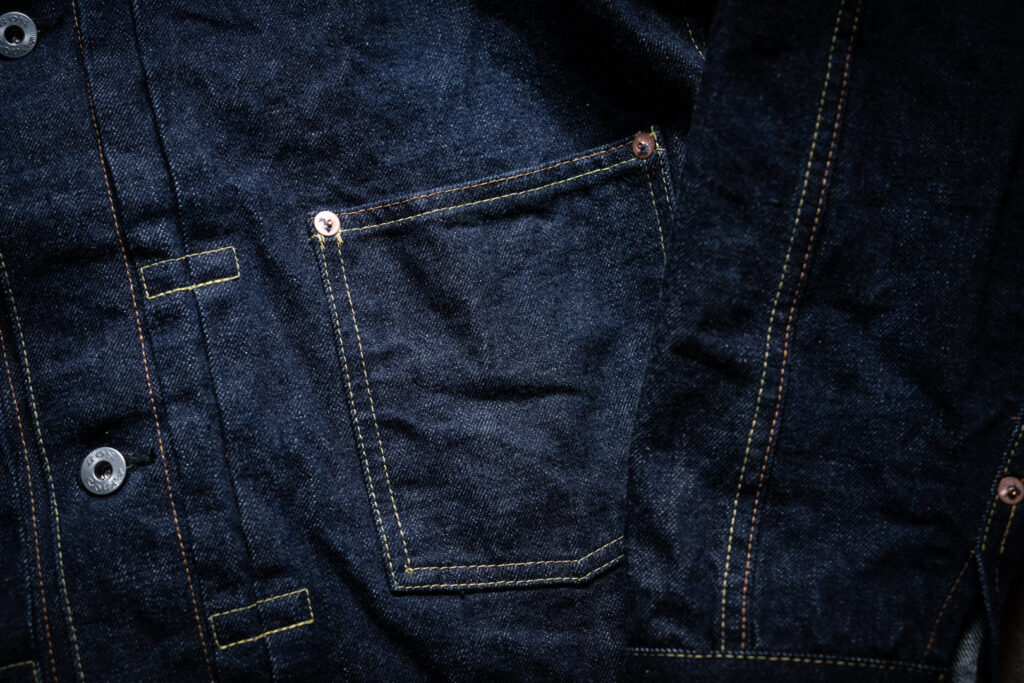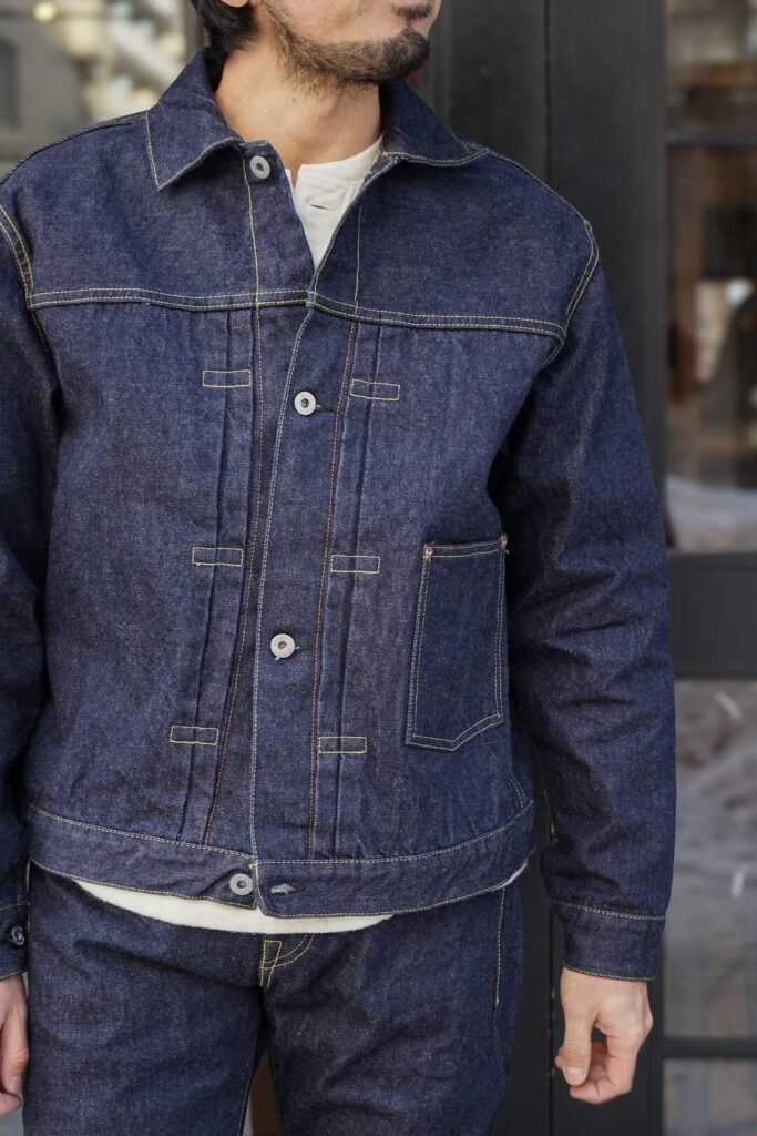 ディテールとしては当時の特徴の一つでもあるポケットのフラップを廃止、ボタンも簡素化されている当時の数に設計しています。