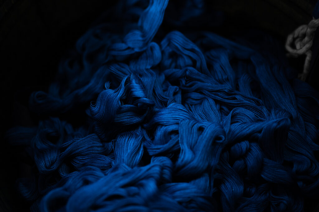 “藍染”には、さまざまな染色方法があり、タデアイなどを発酵させた蒅(すくも)を使って染め上げる伝統的な技法はもちろん、現代では染色の過程で苛性ソーダや助剤を使用して染め上げる技法も多く用いられています。