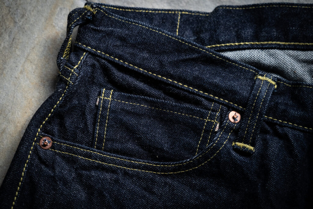 フロントスタイルは非常にシンプル、コインポケットのリベットを外し、バックポケットは敢えて歪みを持たせて当時の不完全さを表現、当時時代背景を投影したデザインになっています。15年という時間を経た今だからこそ辿り着いた、大戦モデルの新たな形です。