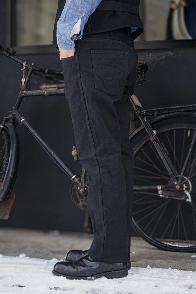 細身ですっきりとしたシルエットの1970年代のL社のコーデュロイパンツのシルエットを参考にデザインしたブラックジーンズです。