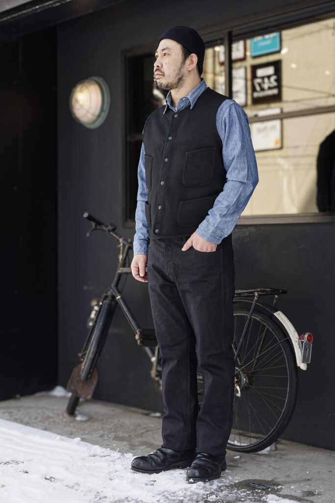 素材は経糸に硫化染めした黒糸、緯糸には反応染めの黒を打ち込む事でインディゴ同様の縦落ち感が楽しめる春夏に最適な12ozデニムを使用。