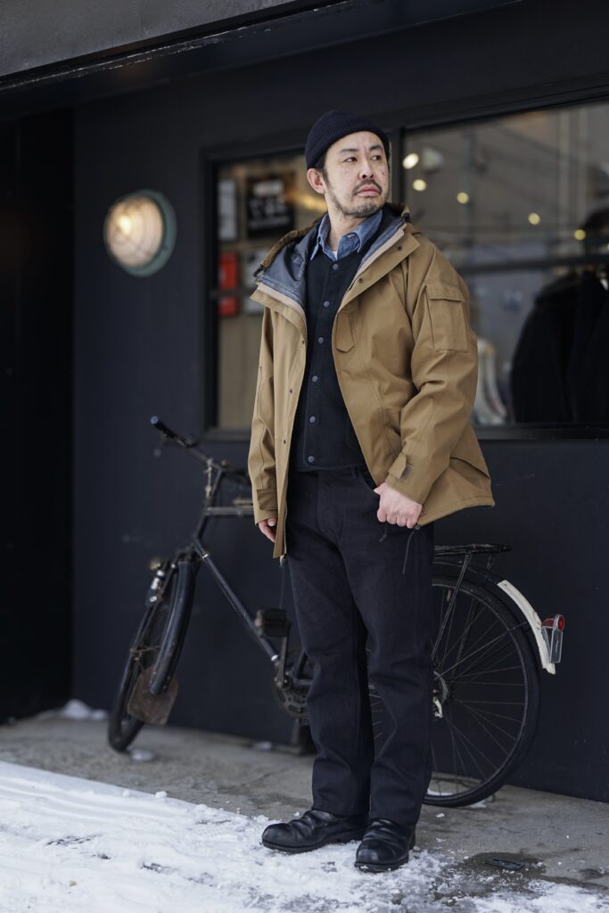 サイズはS.M.L.XLの4サイズ展開で、ウエスト36インチのスタッフ阿部でXLを着用しています。普段はミリタリーパンツやペインターパンツ等、ボリュームのあるパンツを履く事が多い僕ですが、スッキリとしていながらもワタリ幅等、程よいフィットの一本は、僕自身新しいスタイルの一つとして取り入れた一本です。カジュアルなMSG&SONSレーベルに”ECWCS PARKA”にBONCOURAのARCH別注ビーチベスト。シンプルなスタイリングですがしっかりパンツの存在感があります。