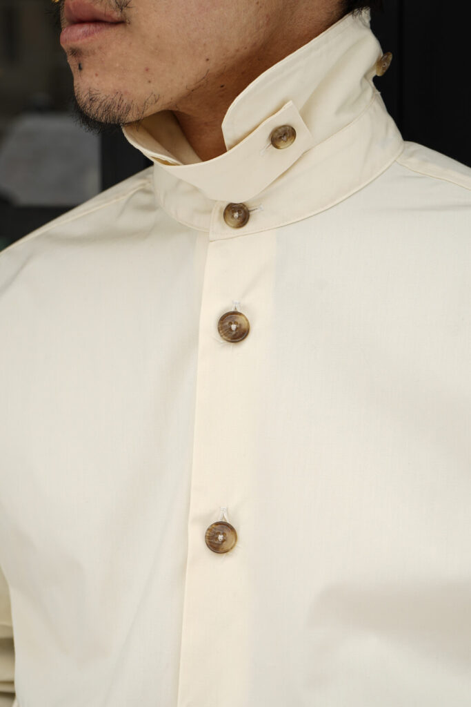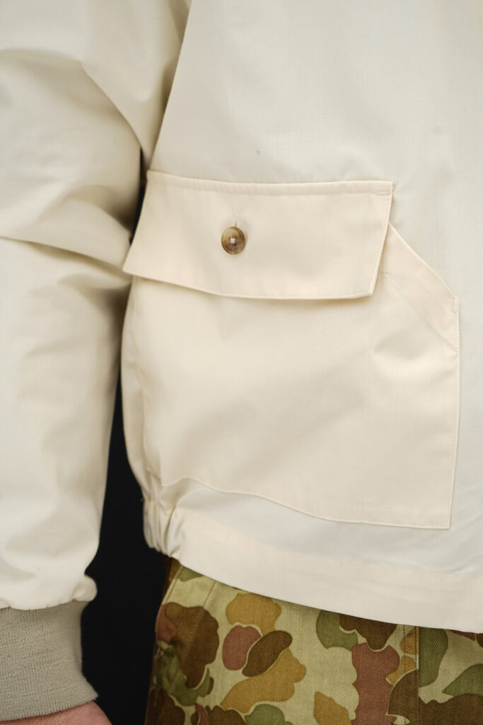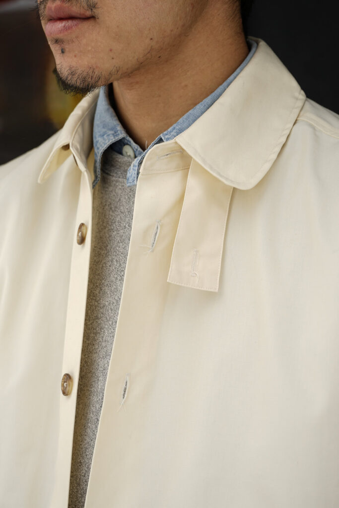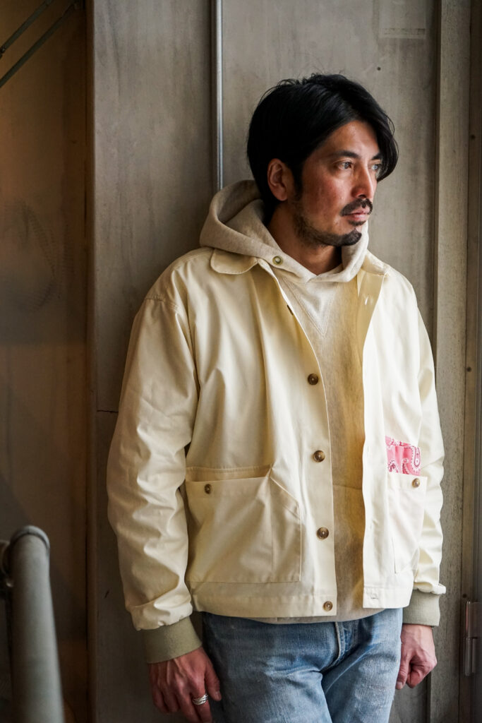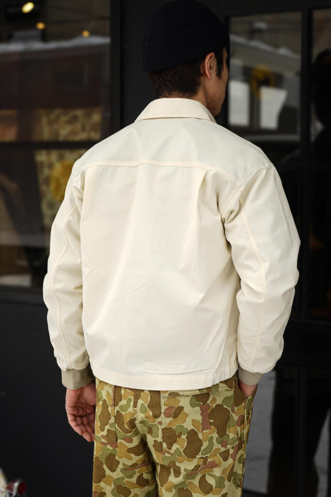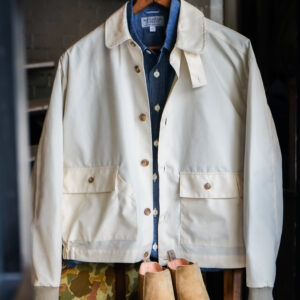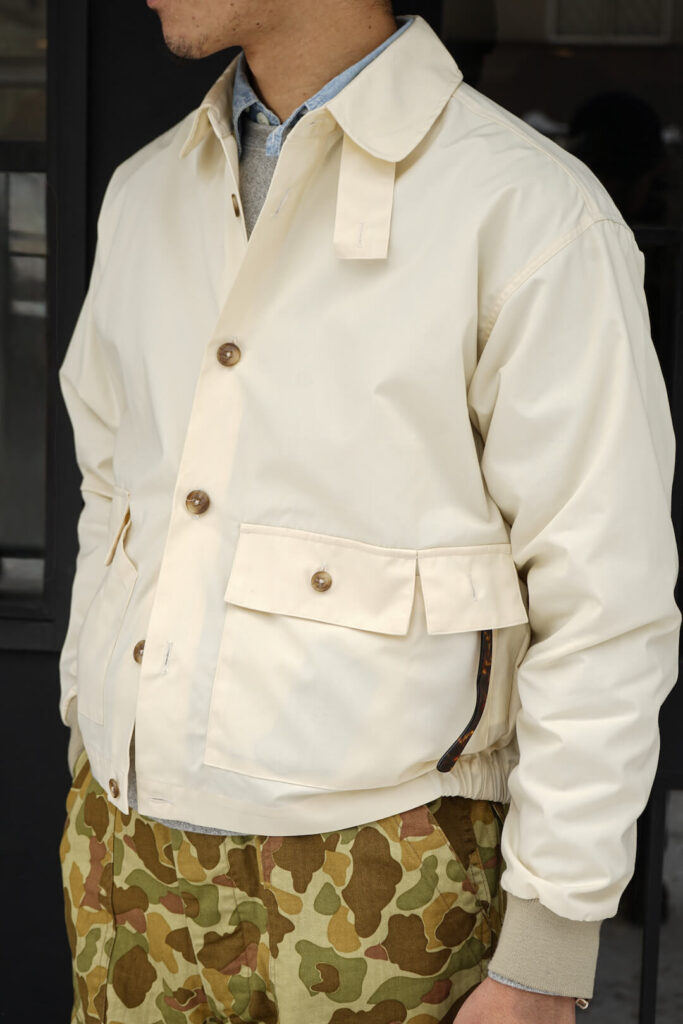 1960年代後半以降、アメリカンアウトドアブランドが軽量化や撥水性をもたらすために、機能素材としてコットンポリやコットンナイロン生地を使用していましたが、そんなアメリカンアウトドアウェアを彷彿させる65/35クロスをドライビングジャケットに使用しています。