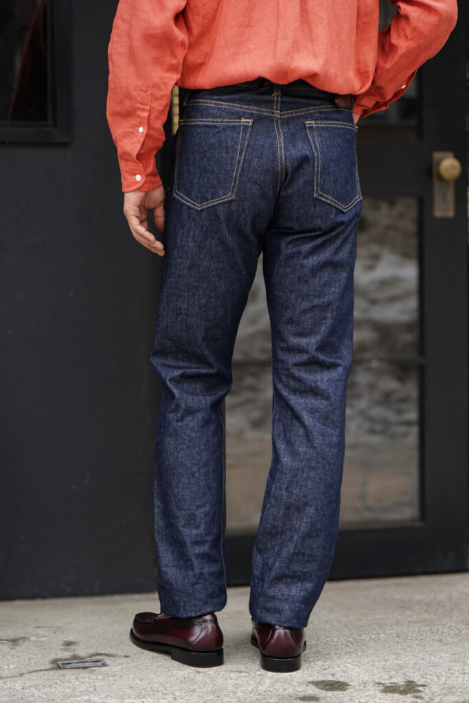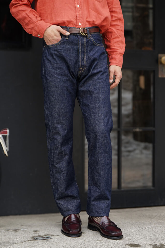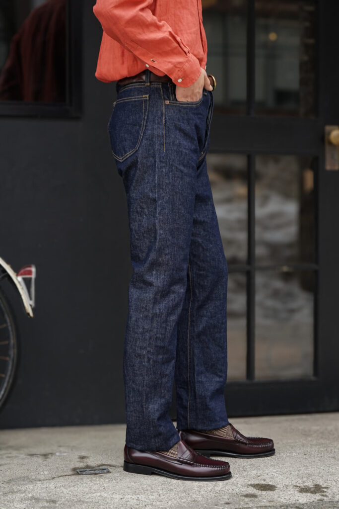 パターン(型紙)は、L社のパターンメイキングに携わっていたファクトリーに在籍するパタンナーがインチ計算にて再構築。これにより、日本とは異なるアメリカ式のパターンとなっています。太過ぎず細過ぎない絶妙なシルエットで汎用性も高い一本。
