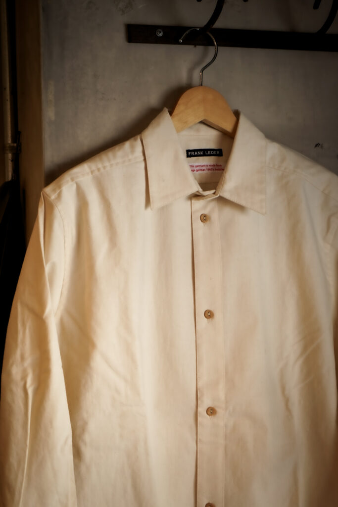 僕自身は、日々日常的にガンガン着るアイテムと言うよりは、その場面場面でビシっと決めたいタイミング等で着用するイメージ、そして襟口等の汚れも目立ってくる為、言わば消耗品というイメージもあります。白シャツ特有の気品さもありながら着込み育てるシャツ、それがFRANK LEDERの”ベッドリネンシャツ”です。