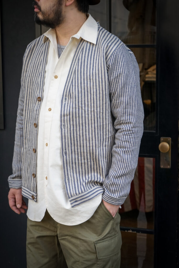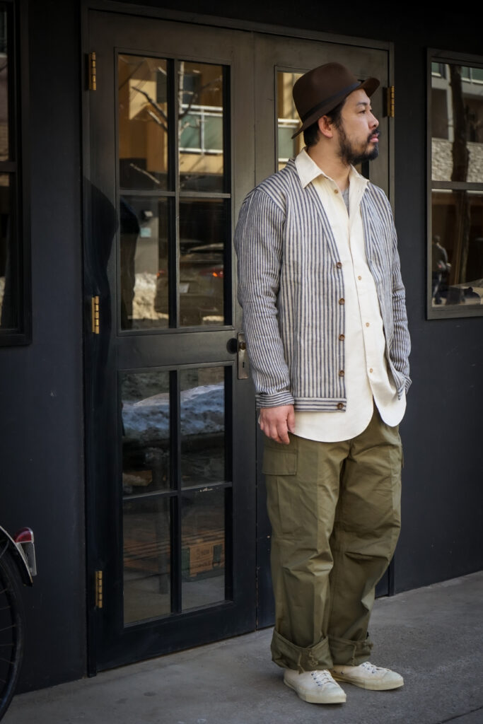ヴィンテージファブリックは当然ヴィンテージウエアとの相性も抜群、ミリタリーパンツとの組み合わせが特におすすめです。FRANK LEDERの上品な雰囲気のパターンメイクは野暮ったさが無く、トラウザーズなんかとの合わせも良いかと思います。