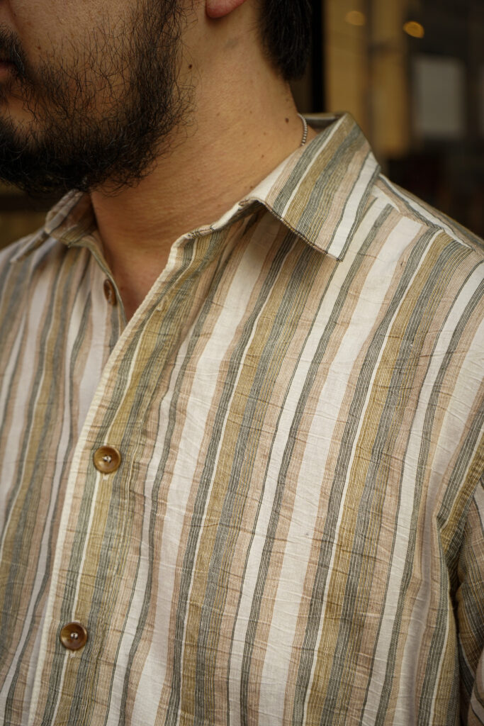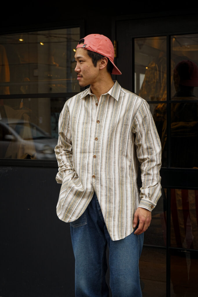 今回自分自身も愛用しているこの一枚はこの生地感とデッドストックでありながら、フェードしたような色気のあるこのストライプの色味に惚れ込み購入に至りました。